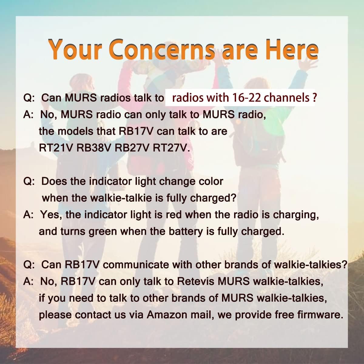 MURS walkie talkie; RB17V MURS walkie talkie can only communicate with murs walkie talkie of Retevis;if you need to talk to other brands of MURS walkie talkies;you can contact us via Amazon mail;we provide free firmware