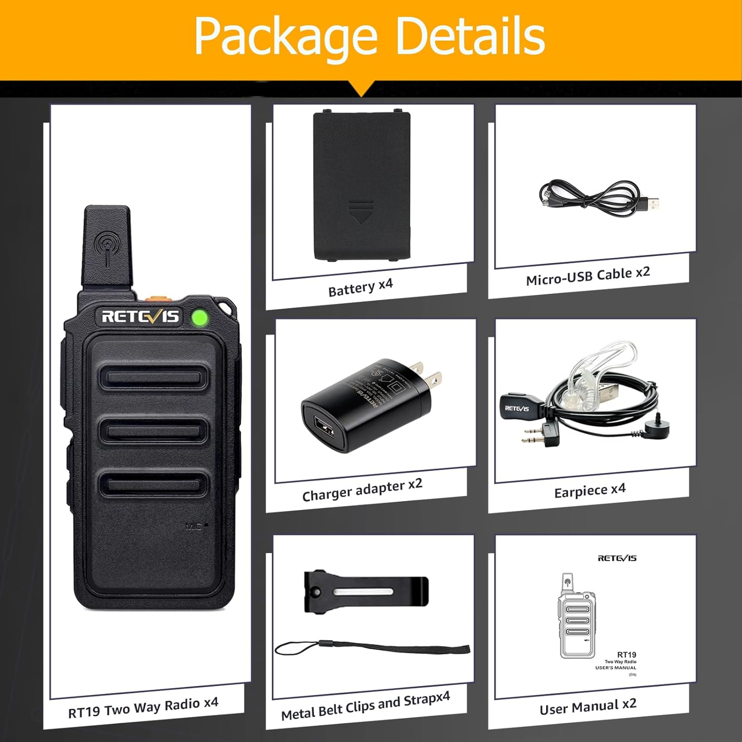 Beautiful black metal back clip; can withstand daily wear and tear; you don’t have to worry about breaking.Package includes:4 x Retevis RT19 Two Way Radio/ 4 x 1300mAh Battery/ 4 x Belt Clip/ 4 x Strap/ 2 x Micro-USB cable(Length:39 inches)/ 2 x Charger adapter/ 4 x Walkie talkies earpiece/ 2 x English User manual
