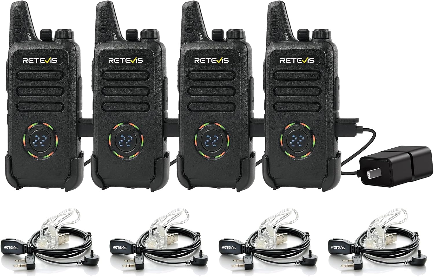 4 X Retevis RT22S Two Way Radios ; 4 X 1000 mAh Battery ; 4 X Belt Clips ; 4 X Mini USB Cable ; 4 X 2 Pin Earpiece ; 2 X Adapter; 2 X English User Manual