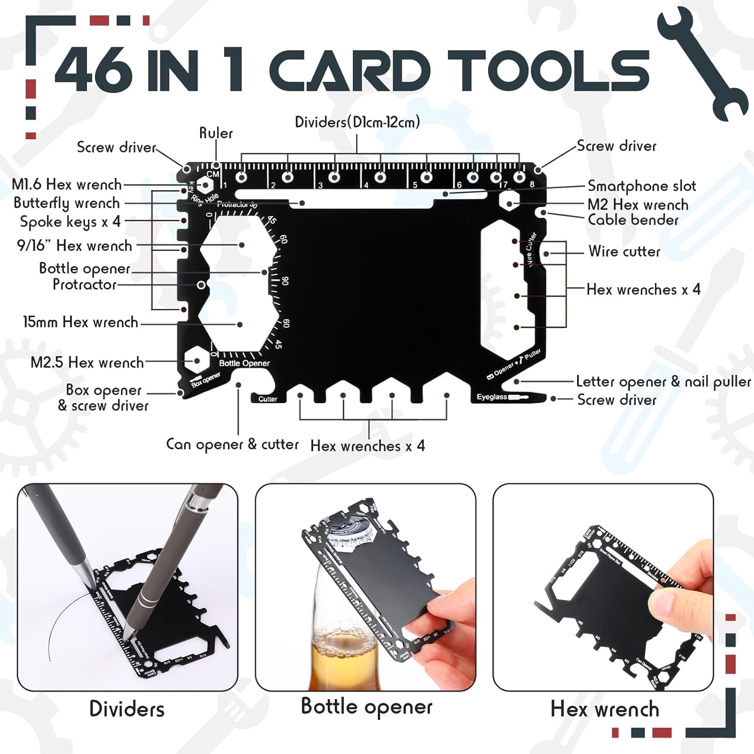 Compact Survival Tool set: this credit card multitool combines 46 functions in one sleek design, from opening bottles to tightening screws, cutting ropes, or measuring in a pinch, this wallet-size card is a practical lifesaver; Each tool card fits discreetly in your wallet and includes tools like a mini knife, wrench, ruler, and more; Thoughtfully encased in a leather sleeve, it’s a smart choice for men who love handy gadgets
