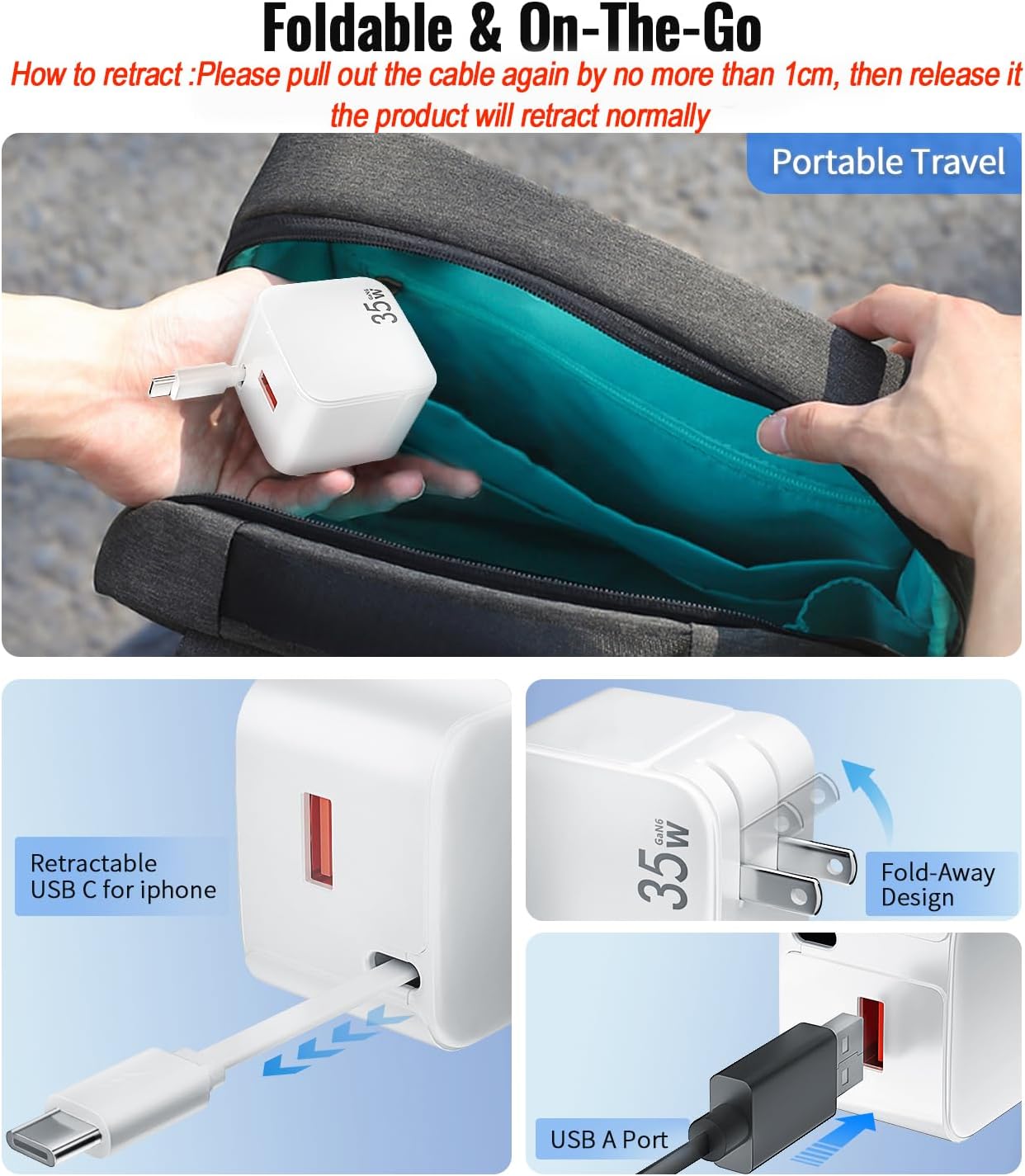 [Dual Fast Charging Port] This PD 35W portable wall charger can fast charge your two devices simultaneously. Only charge one device,max support PD 35W or USB A is 18W. When charge two devices simultaneously, max supports PD 20W + USB A 15W. USB-A Port: For iPhone 16/15/14/13/12 Pro Max,Galaxy S24/ S23/ S22/ S21/ S20/ S20+/ S20 Ultra,Galaxy Note 10/10+/20 Ultra, Switch, Pixel ect. Retractable USB C Cable: For iPhone 16/15 Pro Max,Galaxy,Pixel/Switch/Camera ect