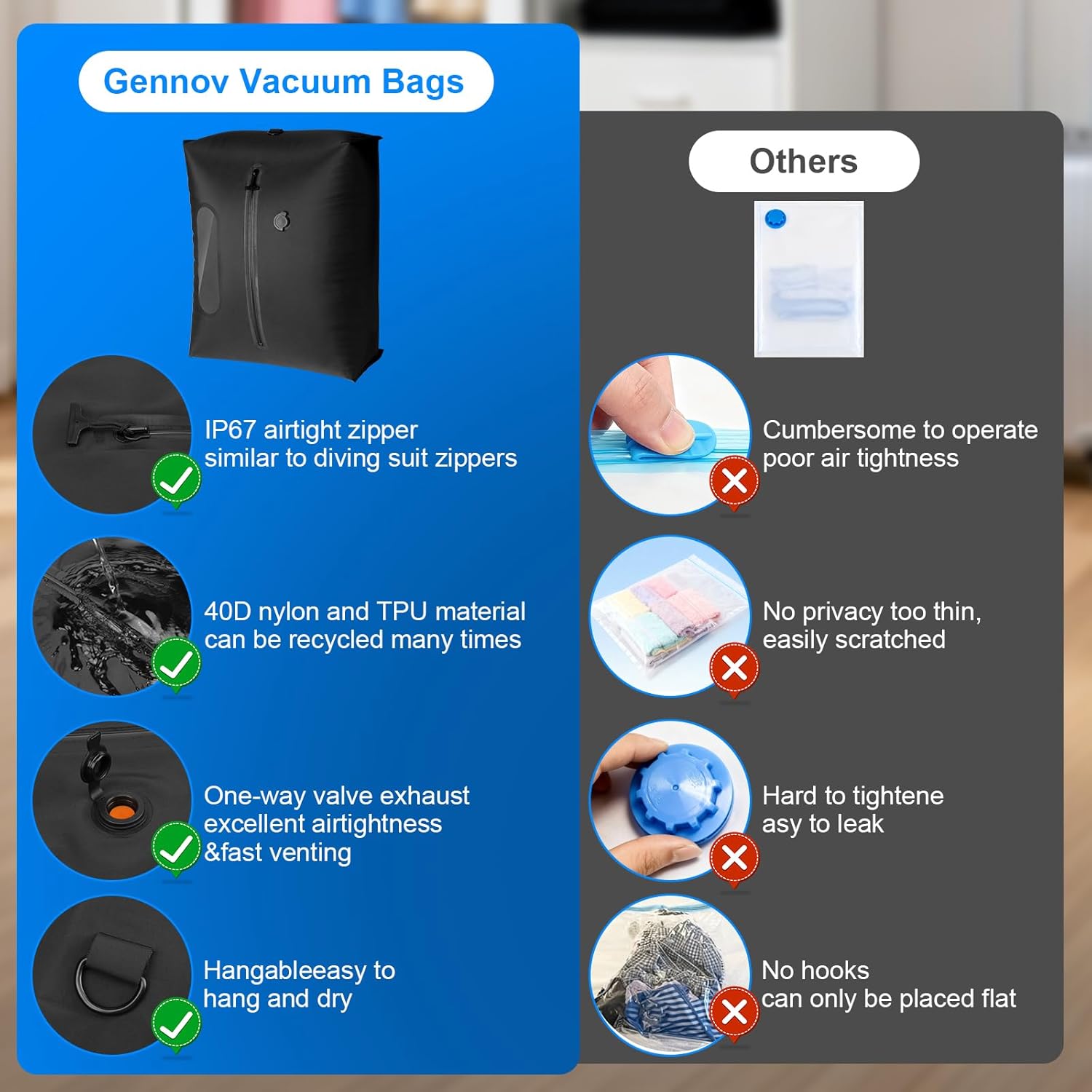 【Reusable Travel Vacuum Bag】Gennov Provides 24-hour responsive customer service and solutions for every Vacuum Bag for Travel. If you value space saving, waterproof design, and versatility more, Gennov Vacuum Bags for Travel is the best choice and a great gift!