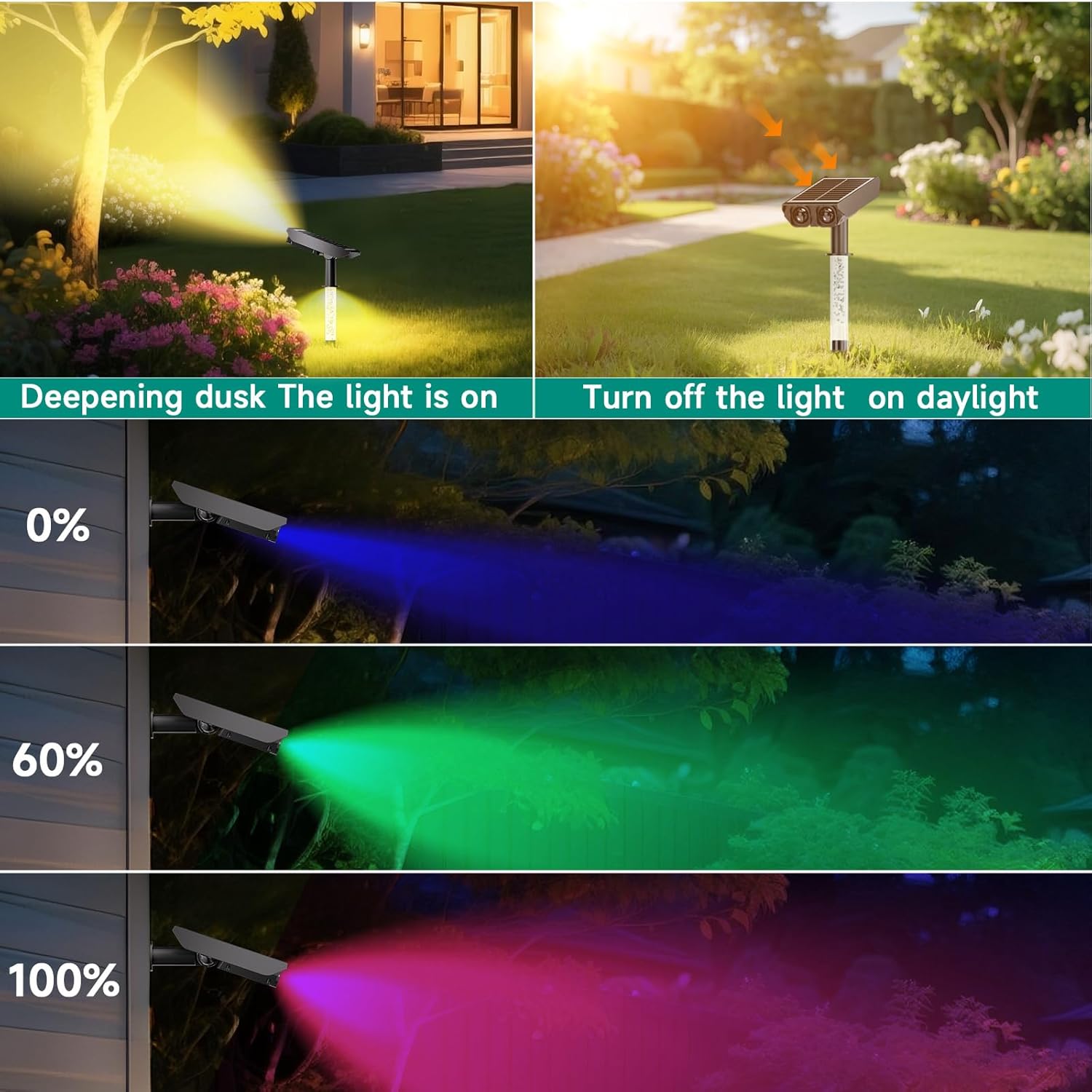 7+1 Lighting Modes & Auto Dusk-to-Dawn Function: Choose from 7 fixed colors (Red, Green, Blue, Lemon Yellow, Purple, Cyan, Cool White) or activate Color Cycling mode for dynamic effects. With two brightness levels—High (6 hours) and Medium (12 hours)—this RGB solar spot lights offers versatile ambiance options. The built-in light sensor automatically turns on at dusk and off at dawn, delivering reliable, energy-efficient lighting with zero manual operation.(Christmas Halloween decoration lights)