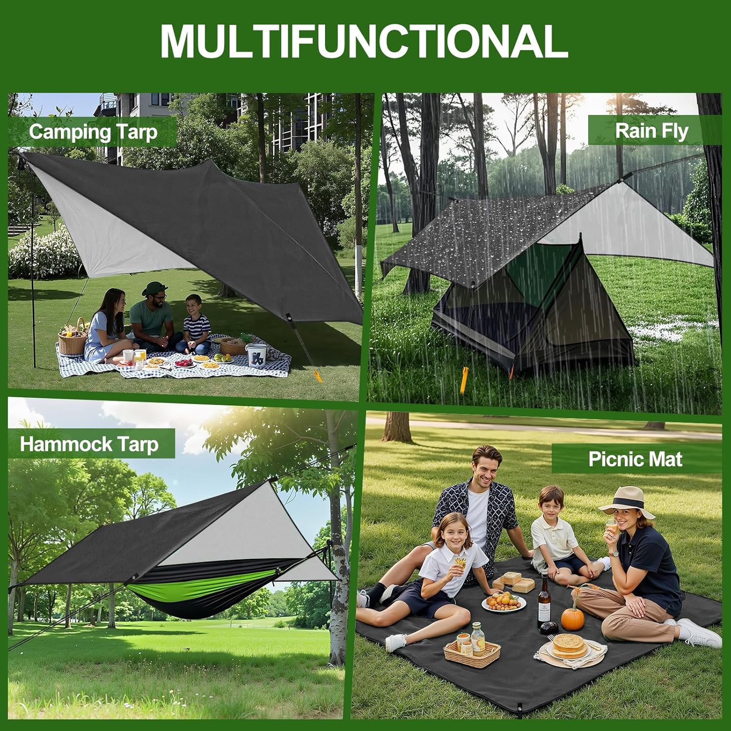 Sunshade Tent: The hammock rain fly is covered with a sunscreen coating that provides protection from the sun and rain. Featuring 3mx3m/9.8ftx9.8ft, it can accommodate 2-3 people to use.