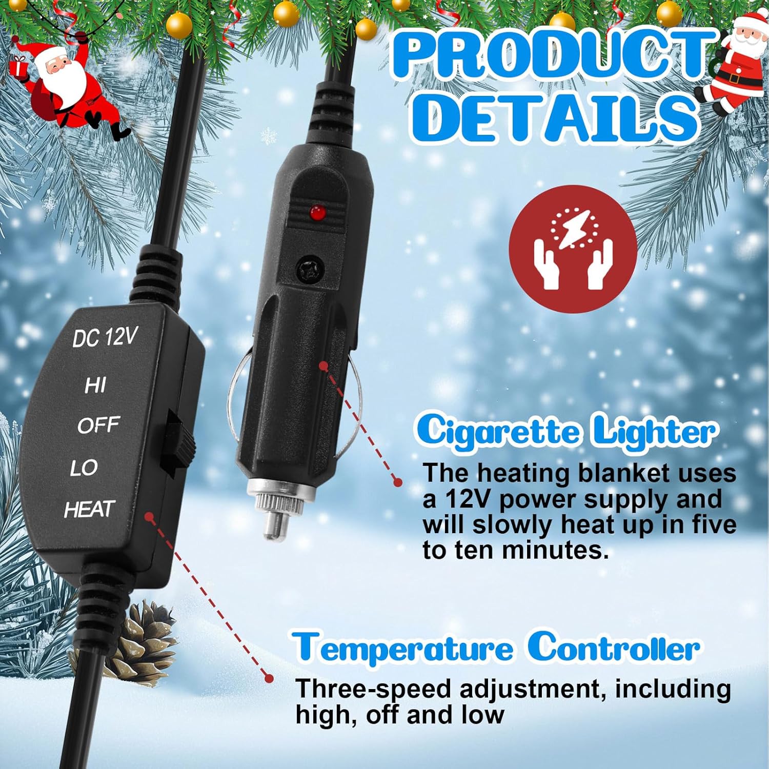 Essential for Emergency with Adjustable Temperature: the 12 volt heated blanket for car is approx. 58 x 43 inches, able to be quickly heated in 15 to 30 minutes; Moreover, there is a temperature controller for you to adjust the temperature from 35°C to 65°C, 3 Heating Levels including low, middle and high, help you get through the cold wind and backup for Emergency Winter