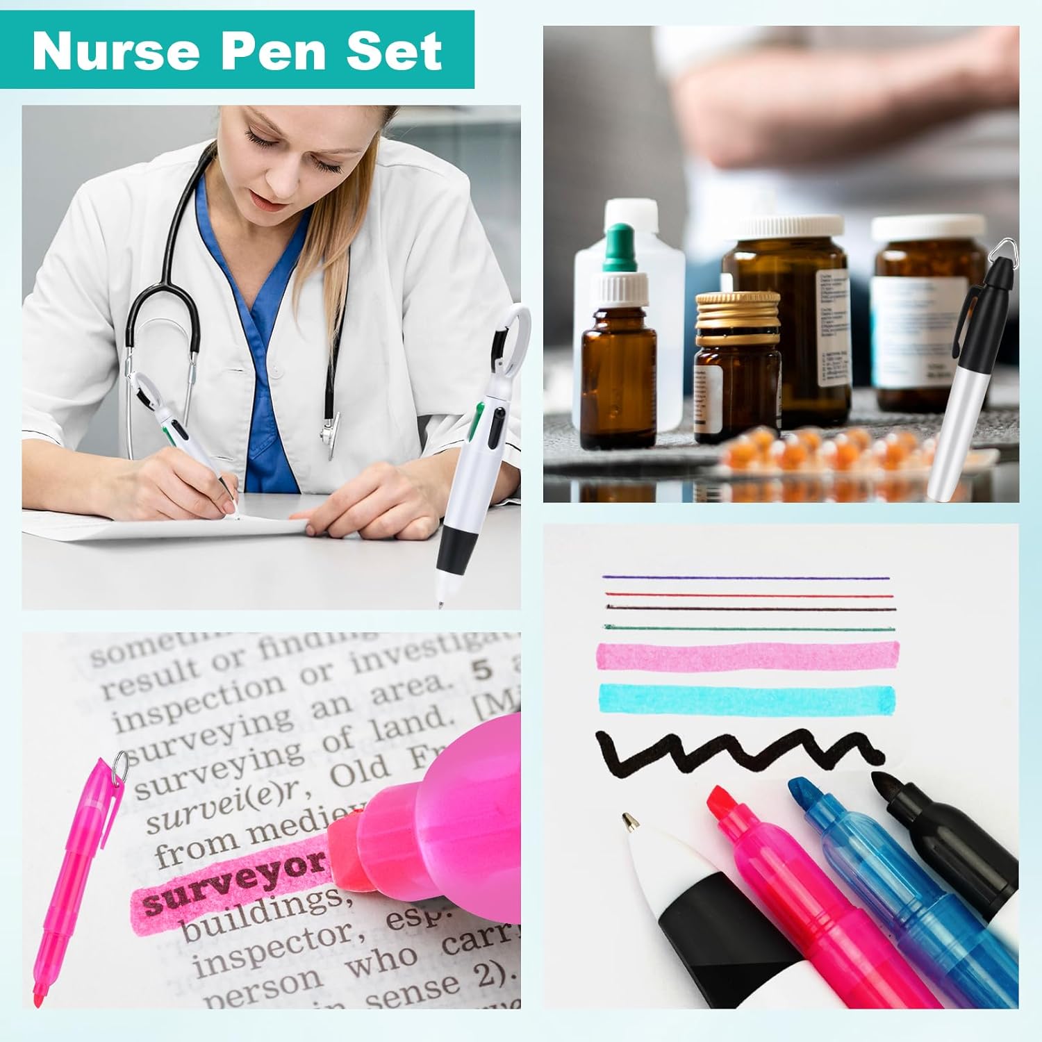 【4Pack Nurse Pen Set】Nurse pen set for badge are suitable for daily work and study, and you can choose different colors and styles to take notes to further enhance your learning efficiency, can be widely applied to office, hospital or attach keys, lanyards, work cards, student cards, backpacks, belts, etc