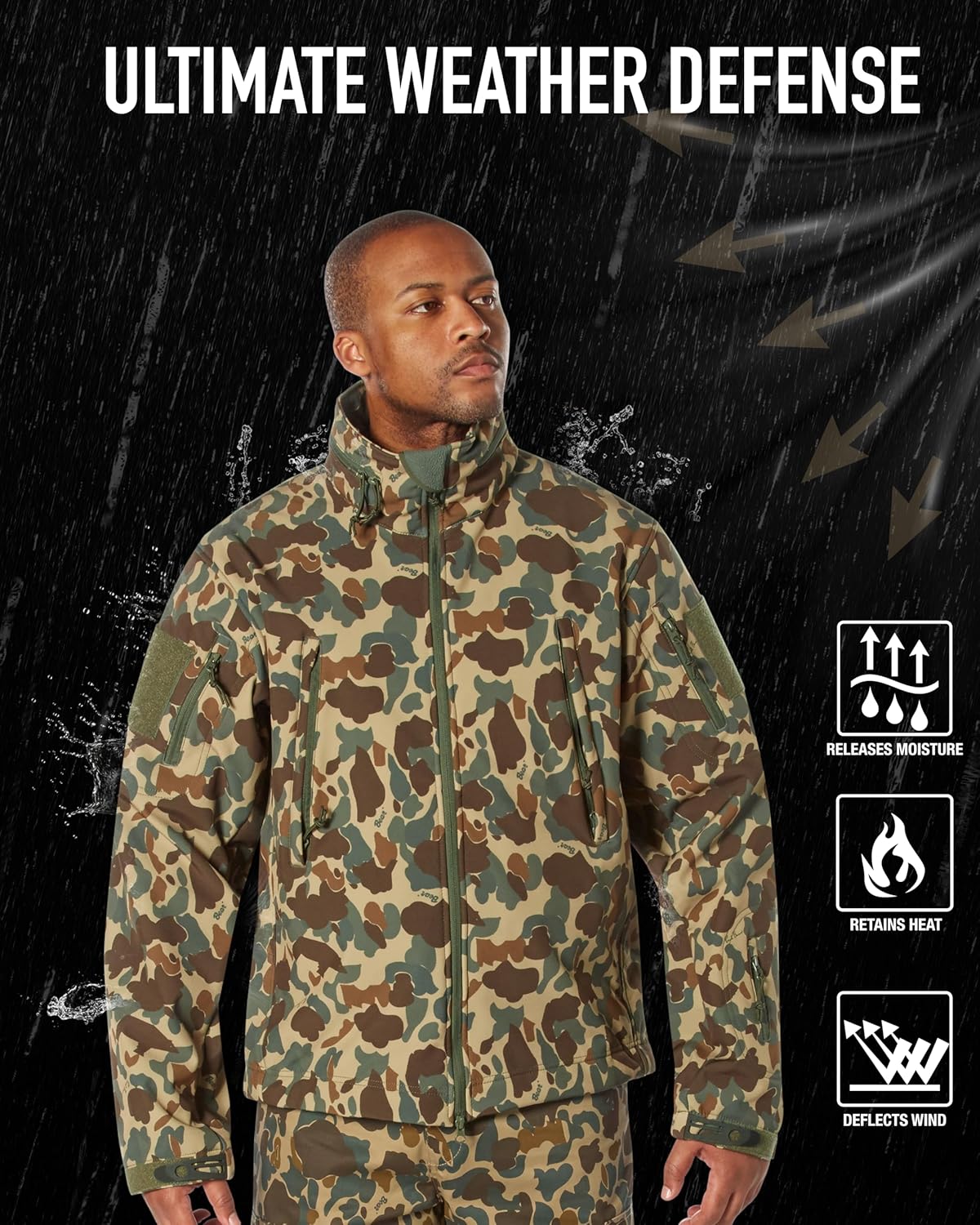 All-Weather Hunting Jacket: Built with Rothco’s Soft Shell 3-layer waterproof fabric, this camo jacket blocks wind, retains heat, and wicks moisture; stay dry and comfortable while braving the elements on hunting trips or outdoor adventures