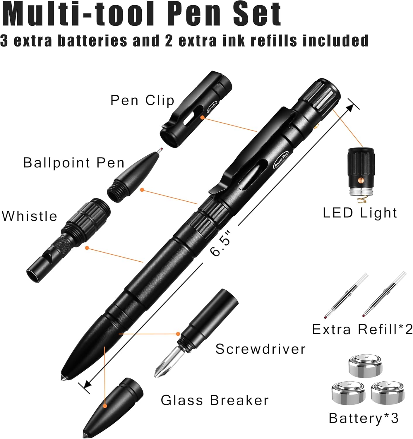 RoverTac Multitool Pen, 5-in-1 Multi Tool Pen with Ballpoint Pen, LED Light, Glass Breaker, Whistle & Phillips Screwdrivers Premium Gift Box, Perfect for Mens Gifts Dad Gift Christmas Gifts