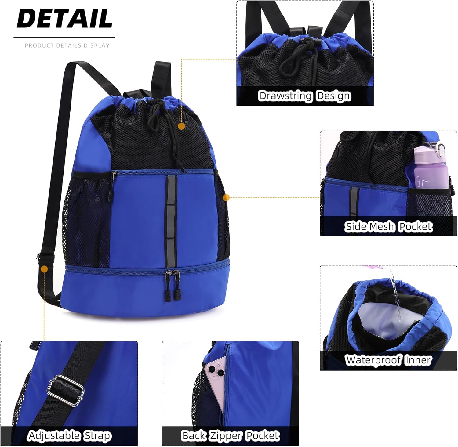 Convenient Compartments – There is a big shoe compartment on the bottom of gym drawstring backpack.The inside zipper pocket can hold small valuables and the back zipper pocket is roomy to fit a cellphone. And two mesh pockets can carry water bottles,umbrella,sunscreen,Etc.