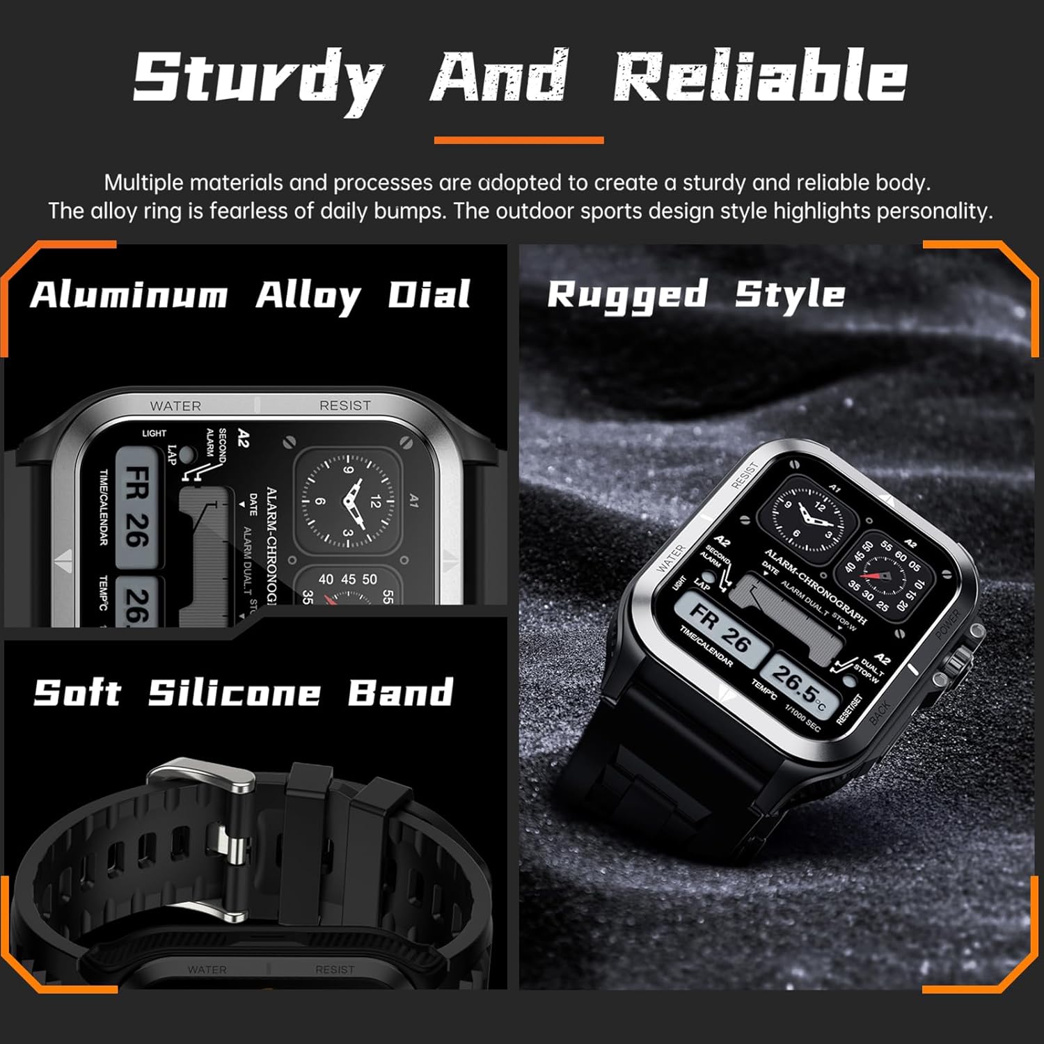 ▶Rugged Iphone & Android Smart Watch — Built in high-quality speakers, supporting Bluetooth calling. Easy to answer/make phone calls, receive SMS, social media notifications (such as WhatsApp, Facebook), and synchronize with music control and AI voice assistant. The AI voice assistant supports voice control, allowing you to perform tasks on your smartwatch using voice commands, completely hands-free.