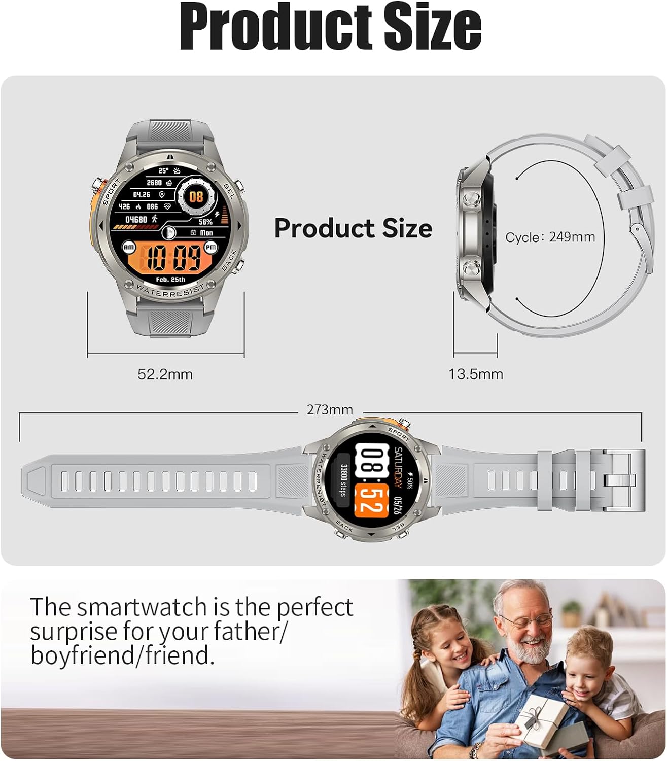 π Military-Grade Durability, 5ATM & IP69K Water Resistance – The military smart watch for men features a TC4 aerospace-grade titanium alloy casing combined with a PVD nano-coating, offering exceptional shock resistance, abrasion resistance, and corrosion resistance. The proprietary multi-sealing technology effortlessly achieves 5ATM dynamic water resistance and IP69K static water resistance. The sapphire glass, known for its outstanding hardness and transparency, ensures long-lasting display protection. Built-in electronic compass, altimeter, and barometer sensors allow you to conquer the wilderness while maintaining a clear mind.