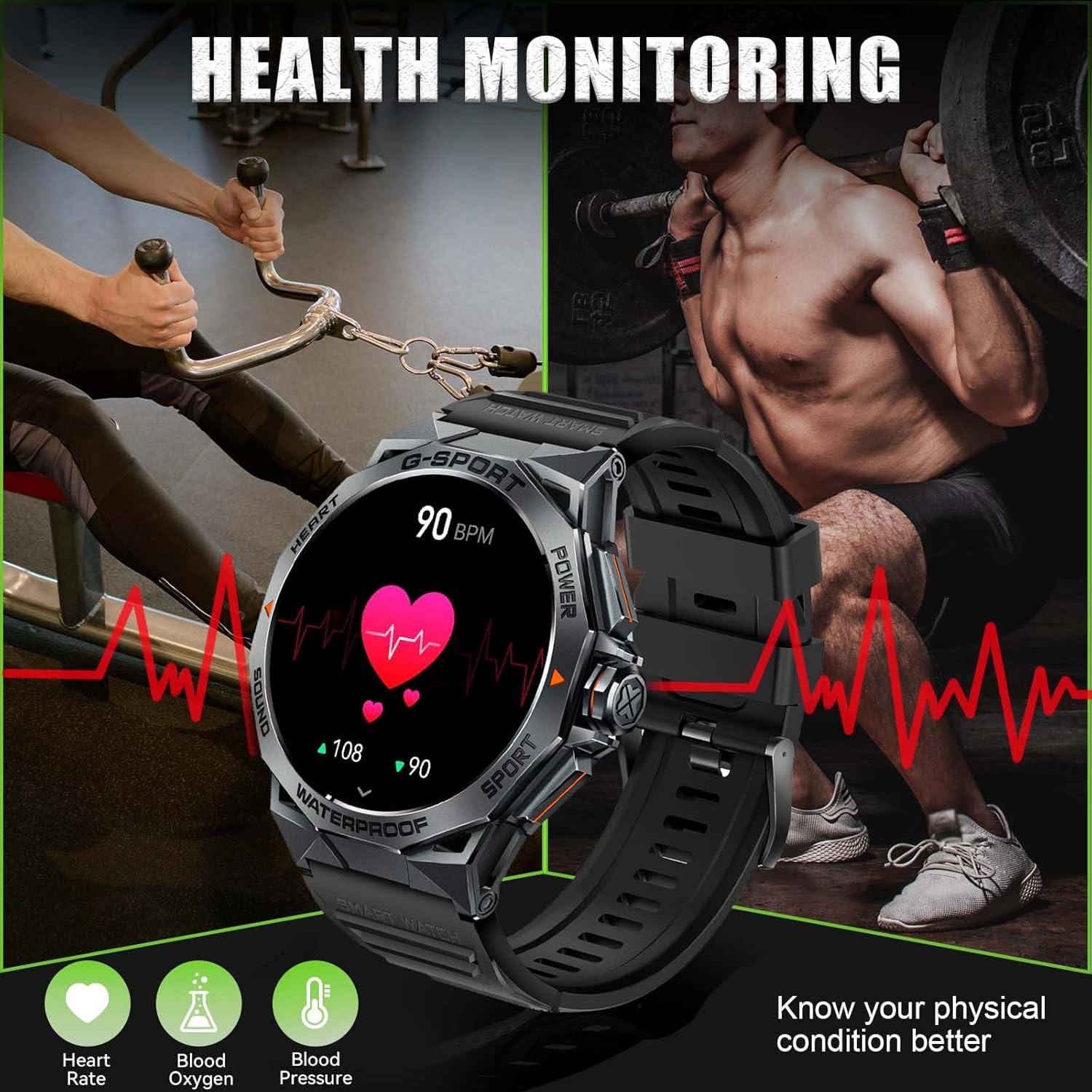 [Activity Tracker with Health Monitor]: HeraQuen outdoor sports smartwatch supports more than 100 sports modes that can meet most people’s exercise needs, it will also record your activity data, such as calories, steps, activity time, etc., and the specific exercise data will be synced to APP. Fitness tracker for men is equipped with sensors to monitor your health such as heart rate and sleep. It also has a sedentary reminder to help you develop healthy habits.
