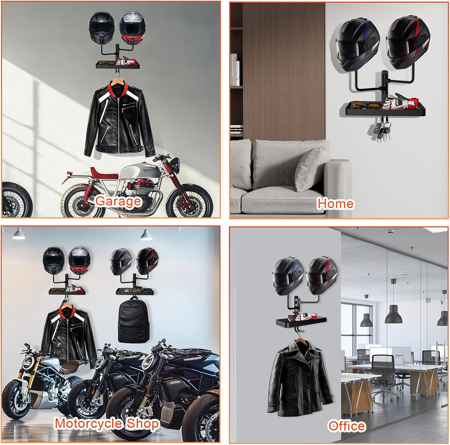 Wall Mount Helmet Displayer: The helmet rack’s compact and efficient design maximizes storage space while minimizing the floor space of motorcycle garage/ storage room usage, effectively improving space utilization. Ideal for motorcycle riders and dealers, police officers, football players, cyclists, bicycle dealers, jacket display enthusiasts, etc.