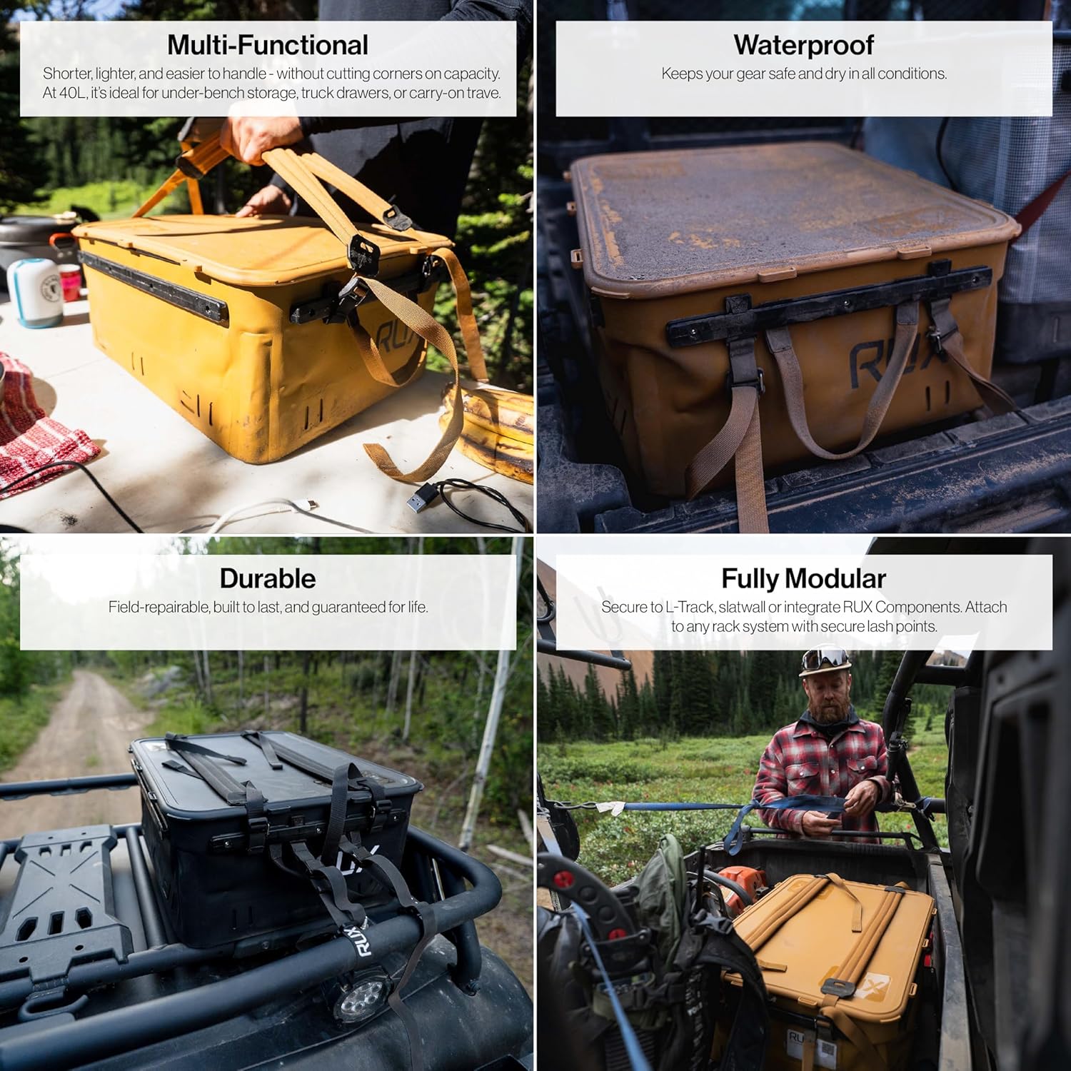 Collapsible & Modular – The RUX 40L stands tall when you need it and folds flat when you don’t. The wide, structured opening makes it easy to load, while its collapsible frame saves serious space. Need fast access? RUX keeps gloves, tools, hydration, and layers visible and easy to grab. Compatible with RUX accessories, it’s more than a camping storage container—it’s a modular, adventure-ready upgrade to your overlanding storage boxes setup.