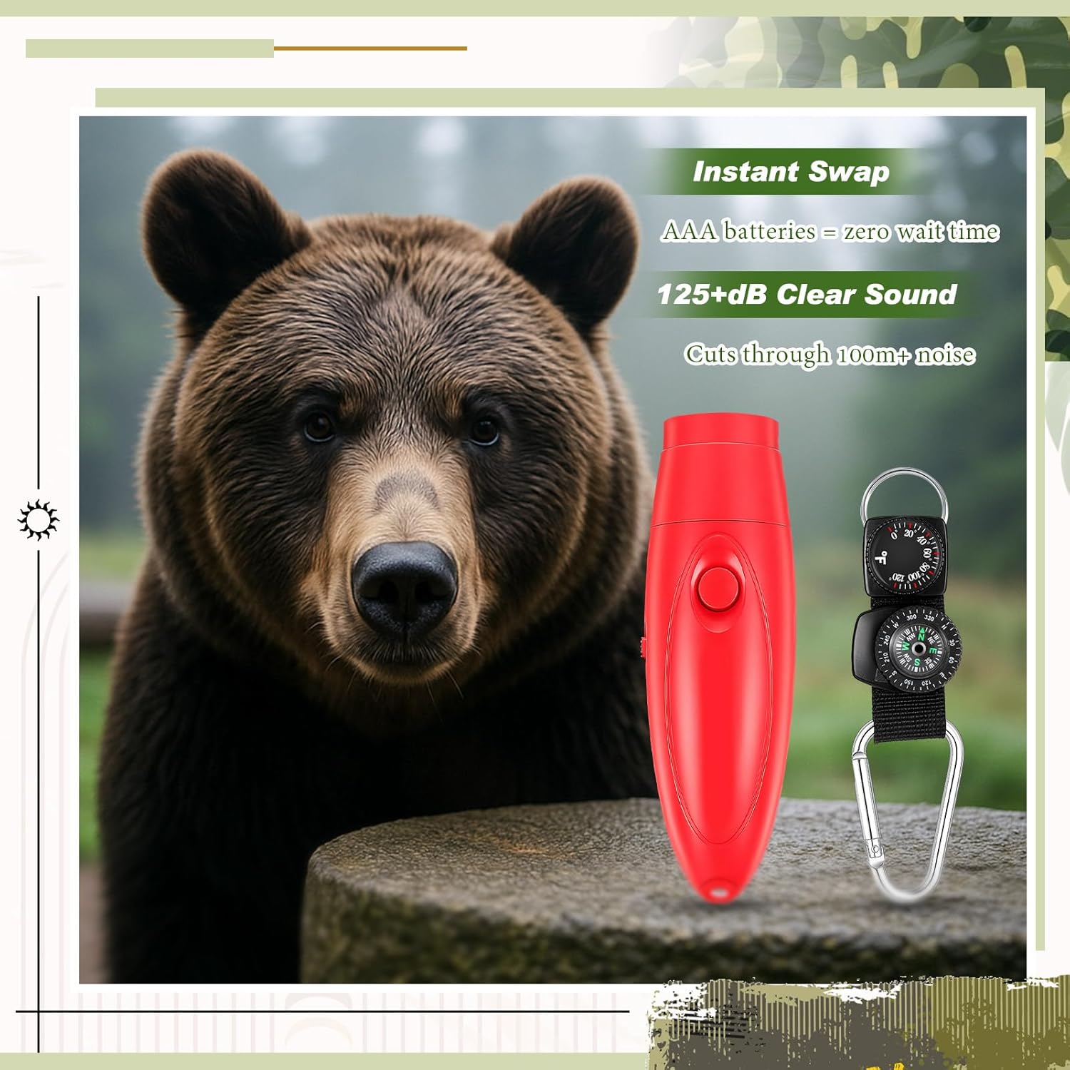 Ultra-portable Survival Tool with Secure Carry: lightweight and pocket-sized with a keychain clip for belt or pack attachment, this bear horn can be attached to any part of your backpack for quick access during outdoor adventures; Engineered for single-handed operation during emergencies, suitable for hiking and camping, this multifunctional device merges bear defense, navigation, and survival readiness into one essential outdoor gear essential