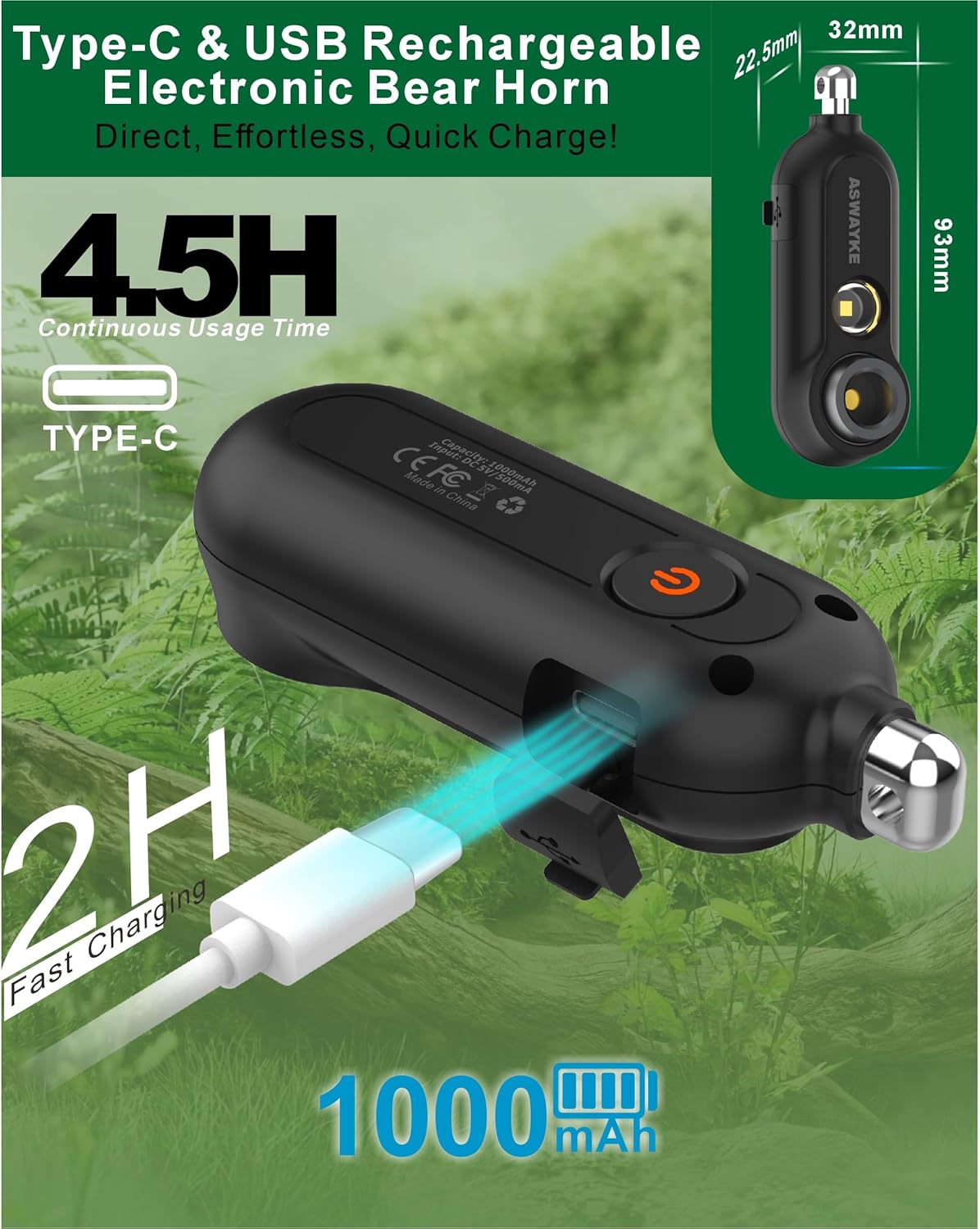 【1000mAh Battery & USB-C Charging】Powered by a robust 1000mAh battery with convenient USB-C charging. Delivers 4 hours of continuous bear-scaring alarm per full charge. Quick 30-minute charge = 1.5 hours of use. Flashing low-power light ensures your bear horn is always trail-ready.