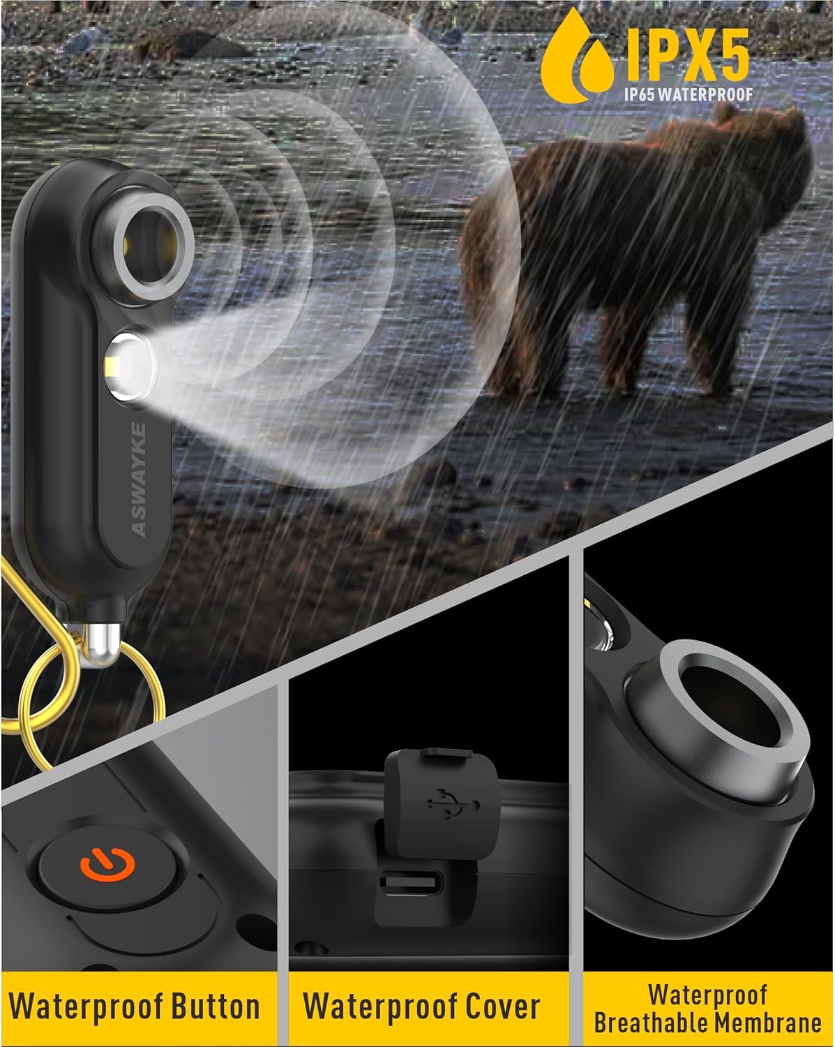 【Dual-Mode Light & Alert】This Bear Horn integrates a high-power LED for essential camping and hiking illumination. Use the tail switch to activate flashing light + loud alarm instantly, a proven Bear Deterrent Device to scare bears away. The back button controls the flashlight; a 5-second press switches alert modes, ensuring versatile outdoor safety.
