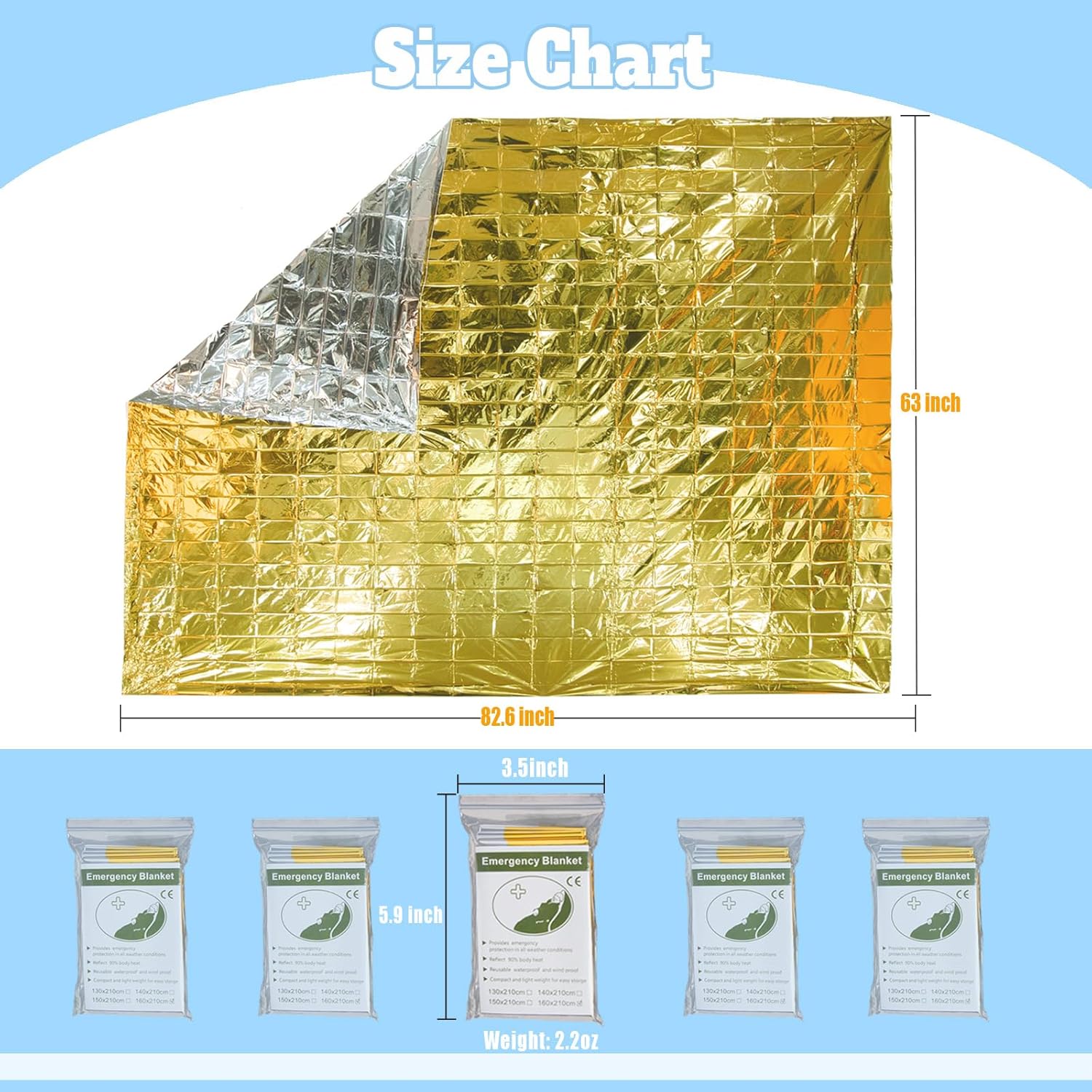 FIVE-PACK CONVENIENCE: Each Emergency blanket in our set is individually folded and sealed for easy storage and retrieval. The size of the emergency blanket is 63 ” x 82.6 ”, we offer a larger width than the standard emergency blanket, ensuring full coverage for adults. Weighing only 2.2oz, they fit effortlessly into your travel backpack or pocket