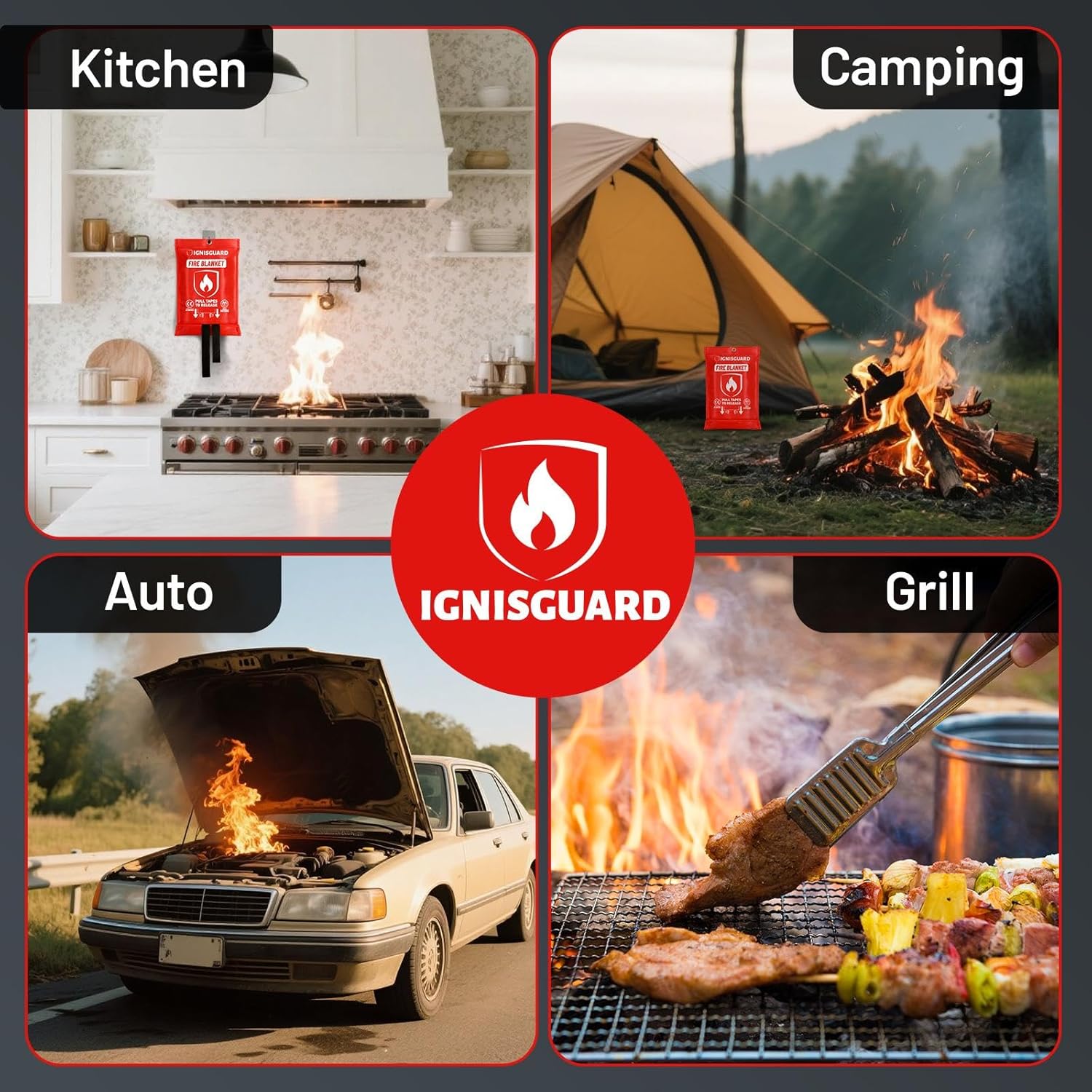 IGNISGUARD Fire blanket 1-Pack IGNISGUARD Fiberglass Fire Blankets 2-pack, with Single 1472°F IGNISGUARD Heat Resistant Glove and 2 Stainless Steel Hooks IGNISGUARD Fiberglass Fire Blankets 4 pack, with 1 pair 1472°F IGNISGUARD Heat Resistant Gloves and 4 Stainless Steel Hooks