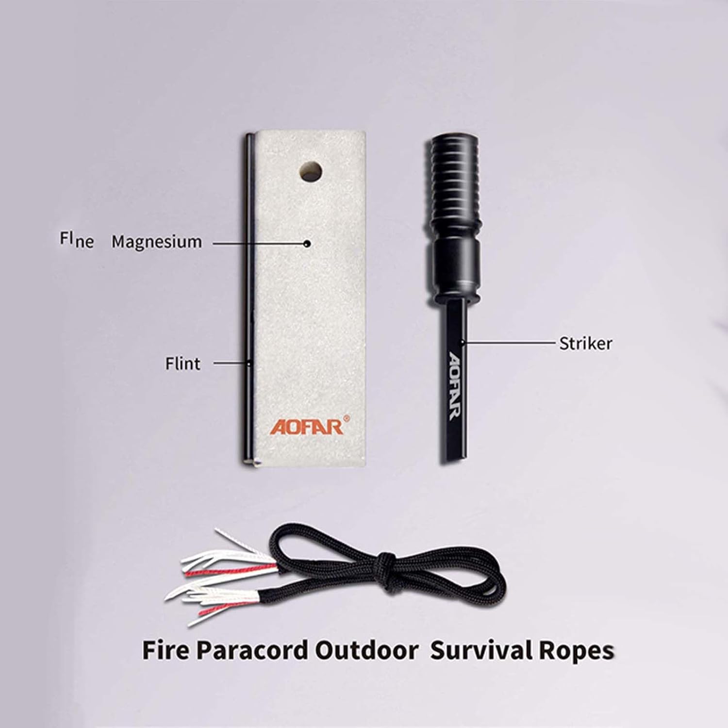 Waterproof Fire Steel: Features a solid 3” x 1” magnesium fuel bar with flint and a 3” steel scraper, paired with Fire Paracord survival ropes.