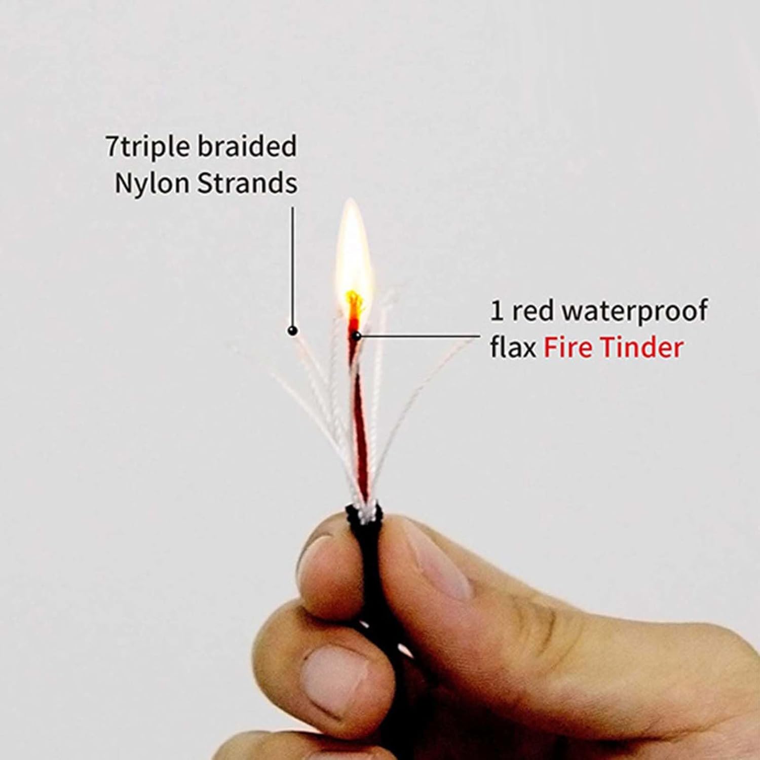 Waterproof Fire Tinder: Includes red waxed flax in the Paracord for instant fire-starting even in heavy rain conditions.