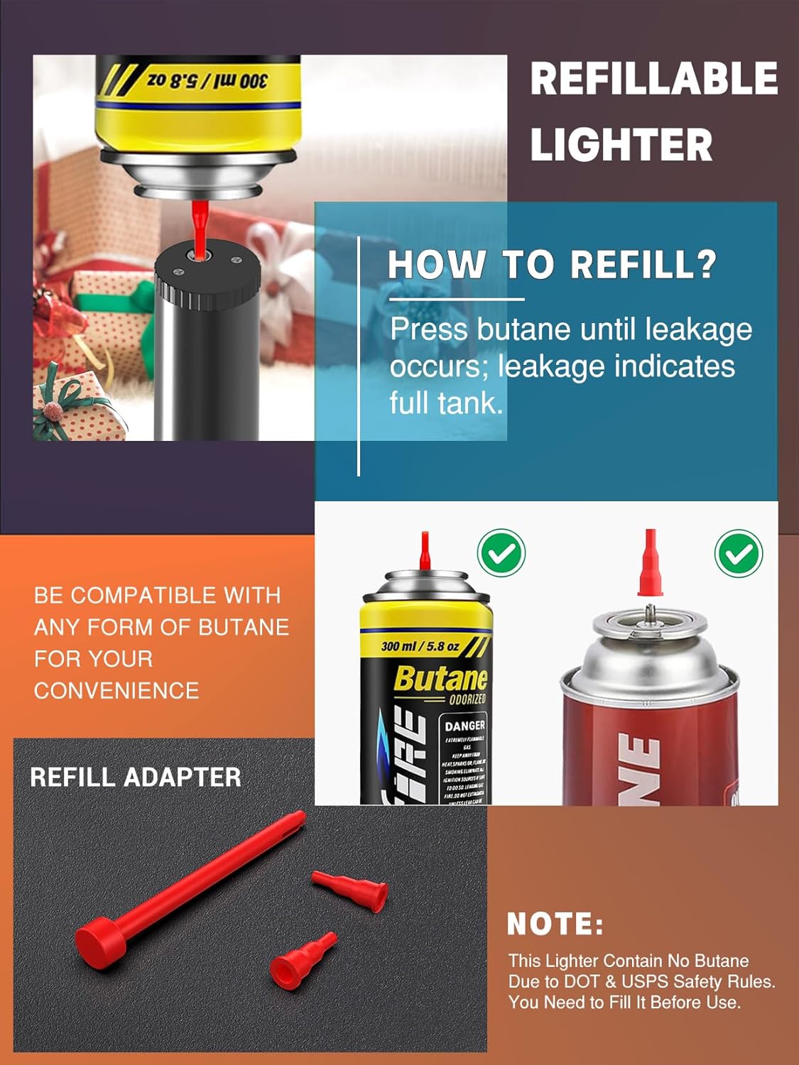 Adjustable Refillable Lighter: To let you use this Butane Lighter more conveniently, this Butane Torch is designed to use various forms of butane; By using the included Butane Refill accessory, press butane until gas leakage occurs, indicating full status, The innovative flame adjustment knob makes flame control simple, turn left to reduce flame as a Candle Lighter, or turn right to maximize it into a powerful blow torch, overcoming situations where ordinary classic lighters fail