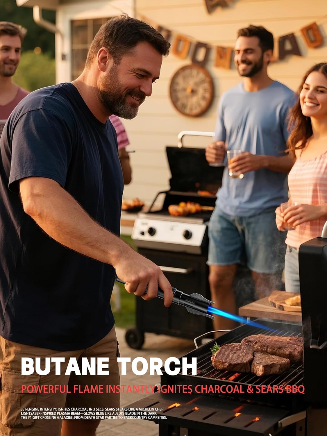 Long-handled refillable adjustable butane torch lighter with safety lock and flame lock. Full metal shell design with flame adjustment knob. 1-foot long jet flame. Suitable for: kitchen use, plumbing repairs, fireplaces, fireworks, welding, camping, outdoor hiking, grilling, BBQ, crafts, crème brûlée, roasting, igniting firewood/charcoal. Target users: lighter enthusiasts, cooking lovers, chefs, homemakers, outdoor enthusiasts, campers, party lovers, BBQ enthusiasts, artisans, DIY enthusiasts, repair technicians. Fuel: Compatible with various types of butane.