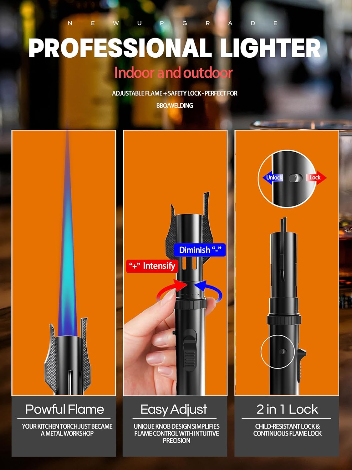 Long-handled refillable adjustable butane torch lighter with safety lock and flame lock. Full metal shell design with flame adjustment knob. 1-foot long jet flame. Suitable for: kitchen use, plumbing repairs, fireplaces, fireworks, welding, camping, outdoor hiking, grilling, BBQ, crafts, crème brûlée, roasting, igniting firewood/charcoal. Target users: lighter enthusiasts, cooking lovers, chefs, homemakers, outdoor enthusiasts, campers, party lovers, BBQ enthusiasts, artisans, DIY enthusiasts, repair technicians. Fuel: Compatible with various types of butane.