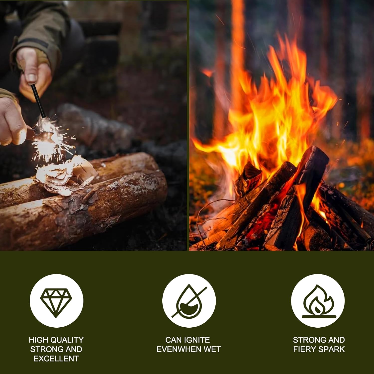 1. All-in-One Outdoor Fire Starting Kit – Meets Various Needs : – This fire starting kit includes a fire starter magnesium rod, a wire saw, fire starting waxed rope,waterproof storage bag,etc. It is a versatile fire-starting tool set designed for camping, hiking, and emergency situations. Practical and thoughtfully designed, it ensures you can easily start a fire in the wild, providing warmth and safety.