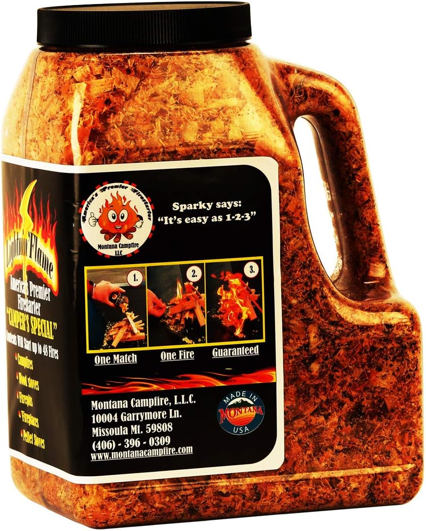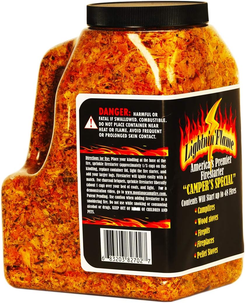 Contains 3 Quarts of firestarter, enough to start up to 48 fires. Waterproof packaging is designed to be carried in your camper, motor home, boat, pickup truck, or pannier, or to be stored at home for your outside firepit, barbeque, home fireplace, or woodstove. Simply sprinkle a small amount of firestarter on, touch a match to it, and enjoy your roaring fire in less than a minute. Once you’ve used this firestarter, you will never bother with newspapers and messy problems again.