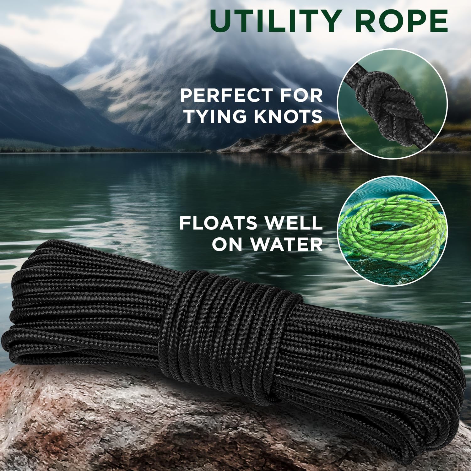 TECEUM Rope – 1/4” & 3/8” – 90 FT | 150 FT – Strong All-Purpose Utility Rope – Camping, Crafting, Flag Pole, Indoor & Outdoor – Polypropylene Nylon Poly Lightweight Diamond Braided Cord – Black