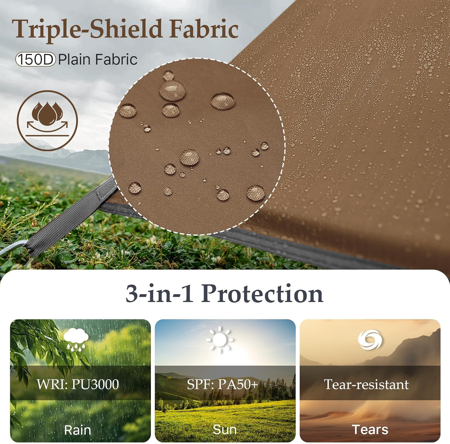 [WATERPROOF AND UV PROTECTION]:The camping tarp tent is made of 150D abrasion-resistant and tear-resistant plain weave fabric,with a waterproof rating of 3000PU.It features professional waterproof adhesive seam materials,enhancing its waterproof,windproof,and snowproof functionality for all four seasons.The tightly reinforced stitching ensures no water leakage.The camping tarp tent can also be used as a sunshade,effectively blocking ultraviolet rays and protecting the skin