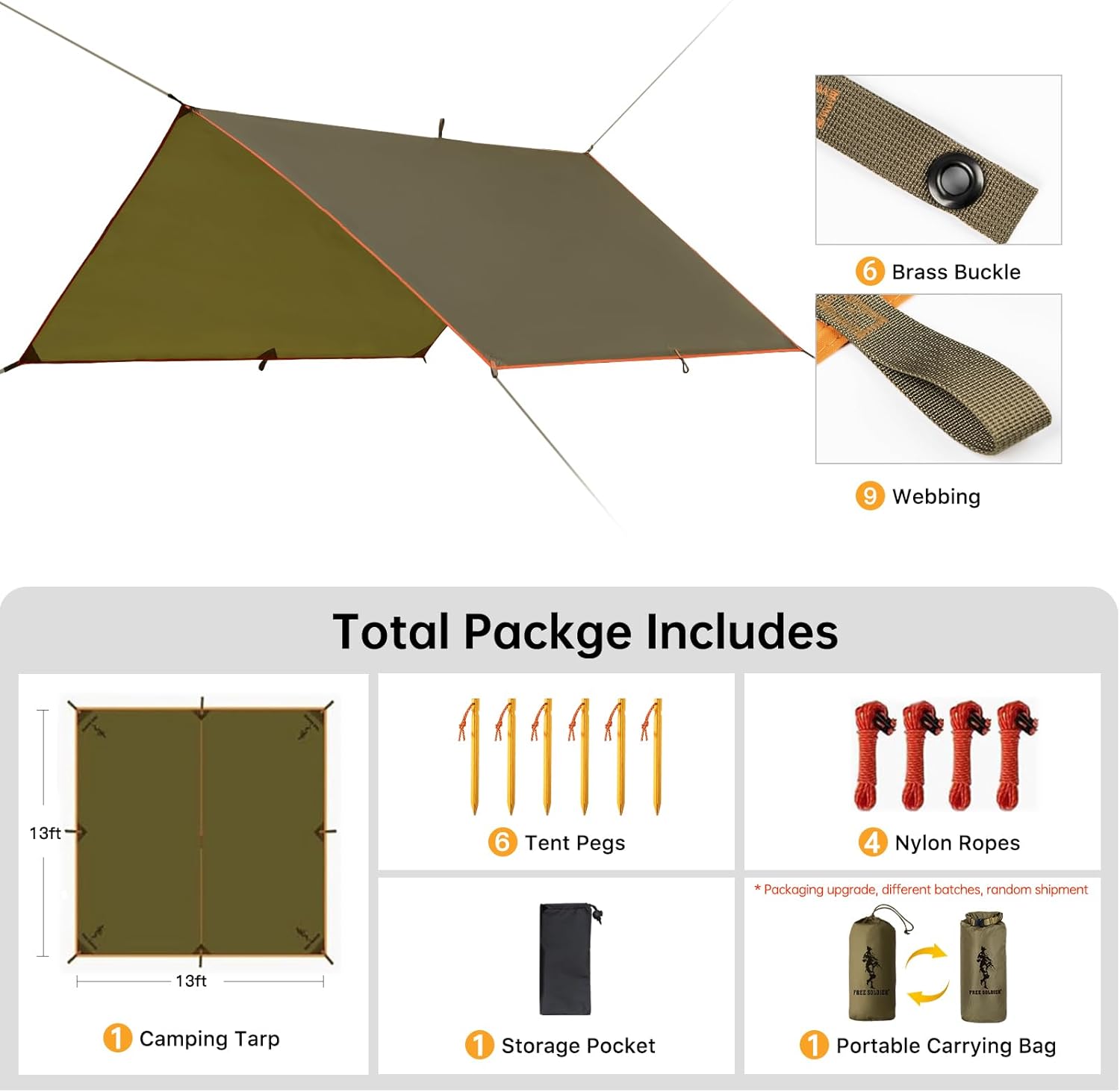 WATERPROOF&UV PROTECTION:Hammock Camping Tarp made of 150D ripstop polyester fabric with 3000 PU waterproof rating,enhanced the shelter’s waterproof function and offers long-lasting protection,strengthen tear resistant&puncture resistant material without any worries.FREE SOLDIER Backpacking Tarp also can be put up as awning is effectively for blocking ultraviolet ray and protect your skin from the sun