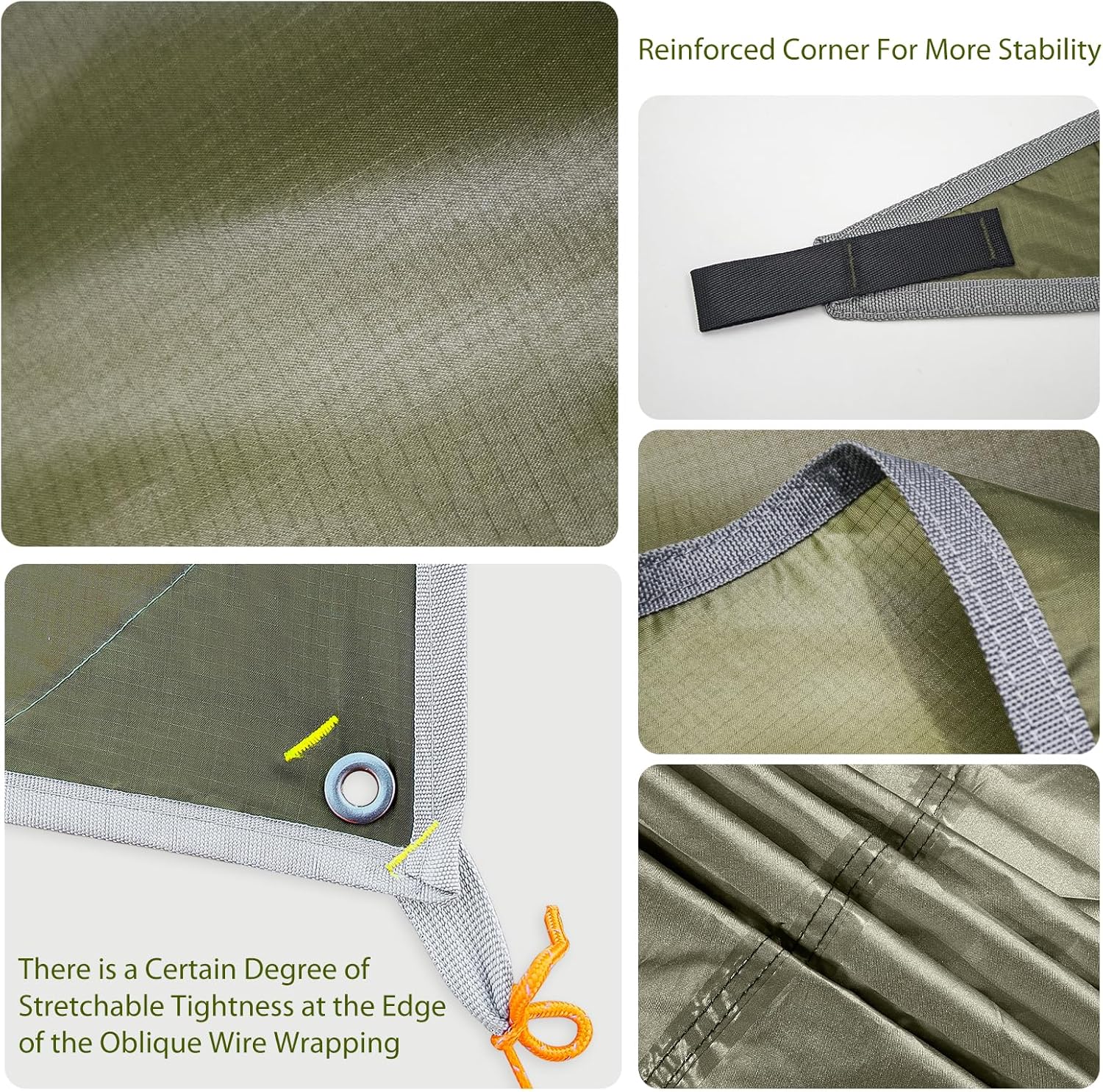 Waterproof/UV Resistant: Made from thickened 210 T polyester fabric, this tarp features PU3000 mm water resistance and UV50+ protection, keeping out wind and rain to keep your tent and camping gear dry