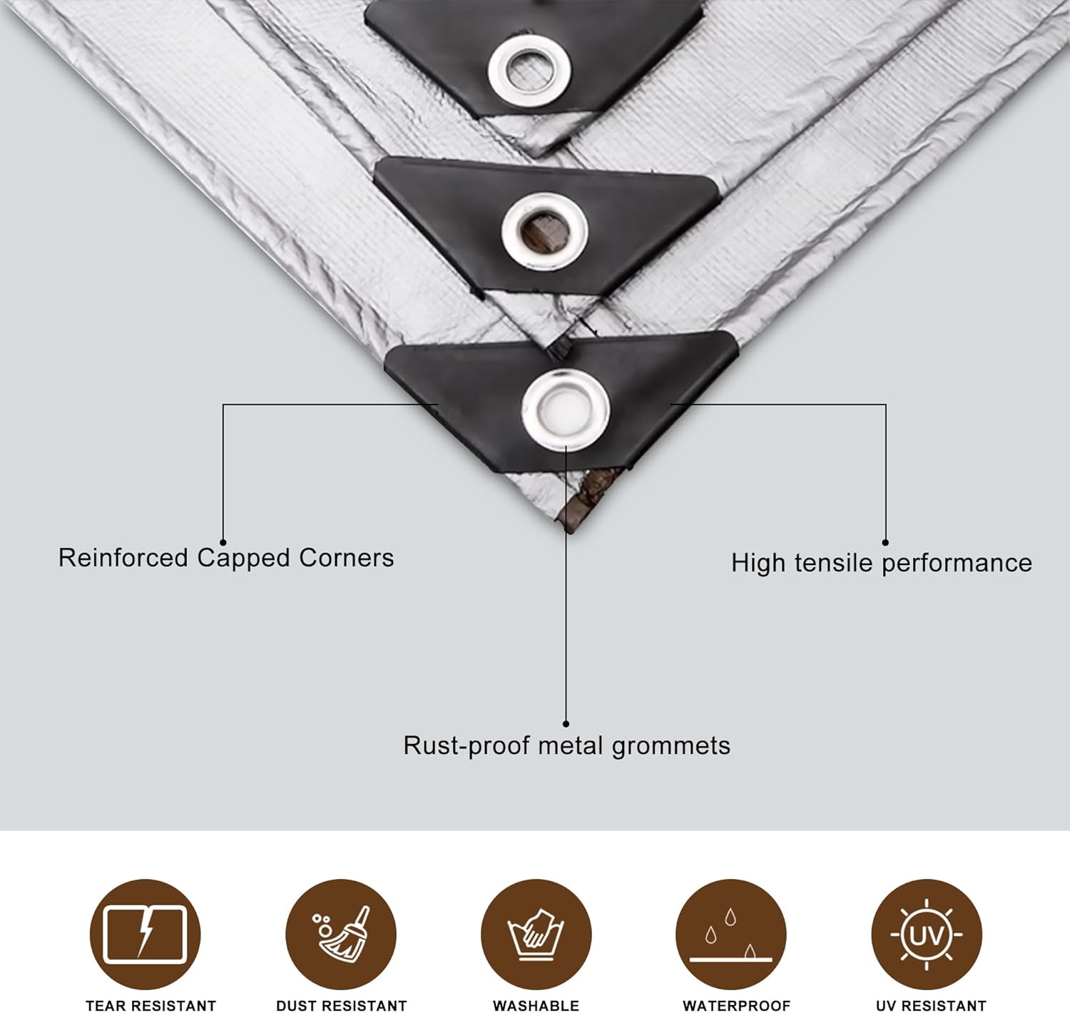 STRONG GROMMETS REINFORCED EDGES:The protective waterproof tarp has a 14 x 14 weave count, reinforced edges and metal grommets every 24 inches. The tear-resistant material is super durable while the metal grommets allow you to tie down the tarpaulin cover easily, using bungee cords or a strong rope.