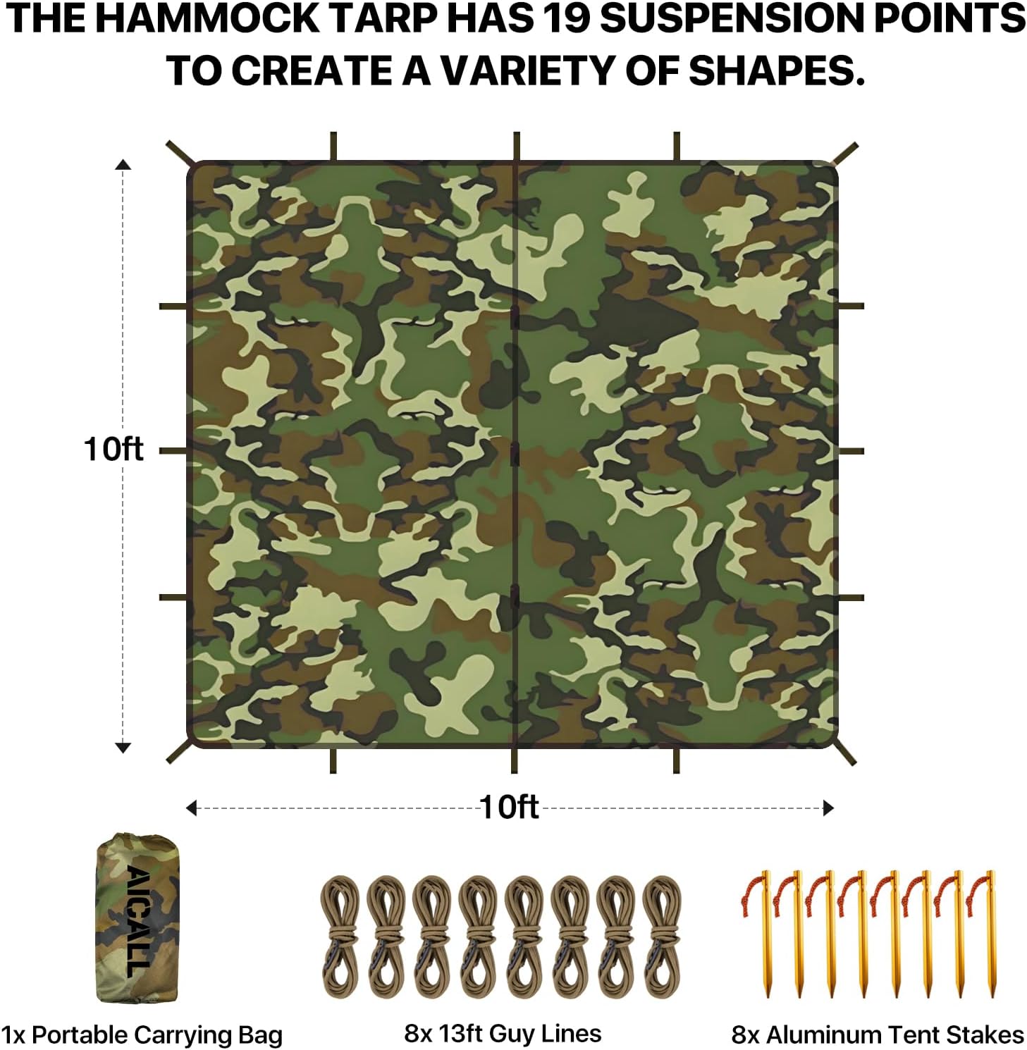 DURABLE & TEAR RESISTANT: AICALL hammock rain tarp has higher fabric density than ordinary 150D polyester fabric. The fabric splices are double-needle reinforced to make the waterproof tarp more durable, tear-resistant, and scratch-resistant. The tent tarp has 19 reinforced hanging points and each stress point is reinforced with nylon webbing to keep the canopy stable in windy conditions