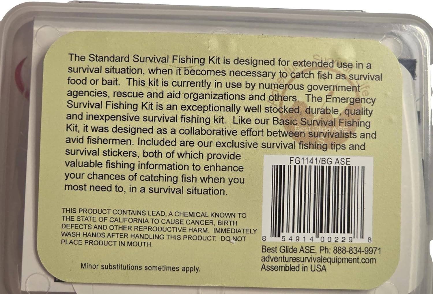 The Best Glide ASE Standard Emergency Survival Fishing Kit is an exceptionally well stocked, durable, quality and inexpensive survival fishing kit. It is assembled in the USA utilizing a horizontal hinged-lid plastic container. We have included a Silica Gel Desiccant inside for moisture absorption.