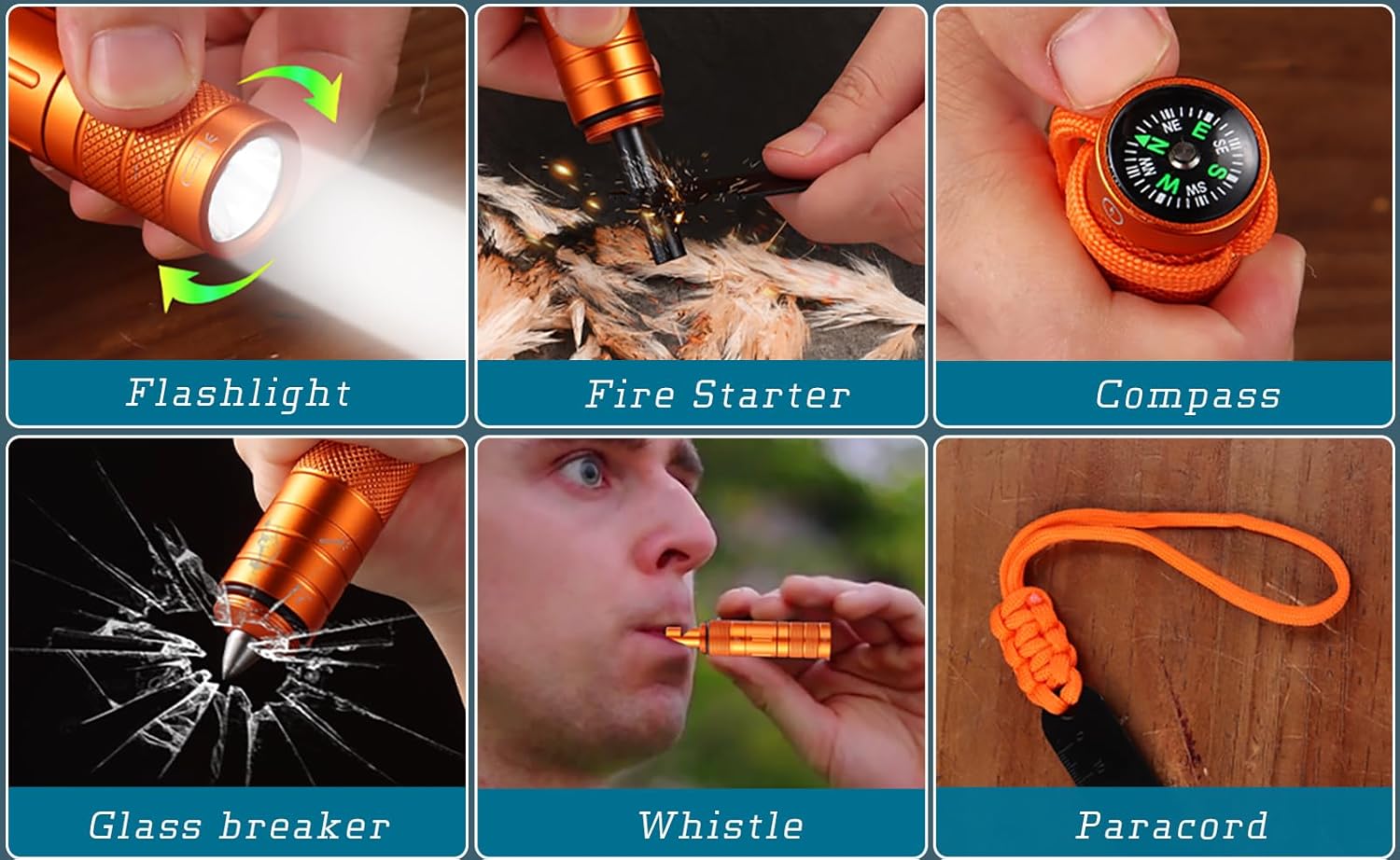 All In 1 Survival Kits: Feartured with LED flashlight, whistle, fire starter, window breaker, compass, bottle opener, 5cm ruler and paracord.