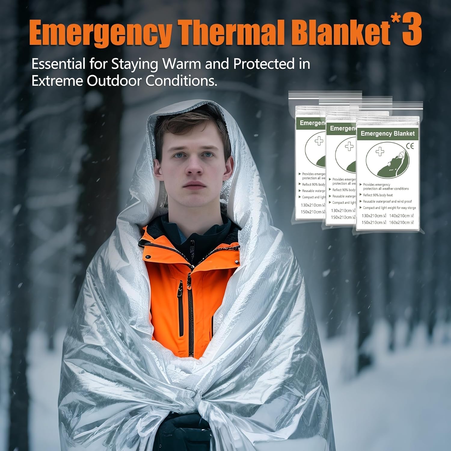 【Emergency Thermal Blanket】 Engineered with lightweight & aluminized, weight only 55g, this thermal blanket reflects of body heat to combat hypothermia in freezing temperatures, while its waterproof, windproof design shields against rain, snow, and harsh winds. Beyond warmth, its high-visibility silver surface doubles as a rescue signal to attract attention, and serves as a versatile shelter—deploy it as a ground cover or tent liner. Durable yet , it’s indispensable for hiking, disaster prep.