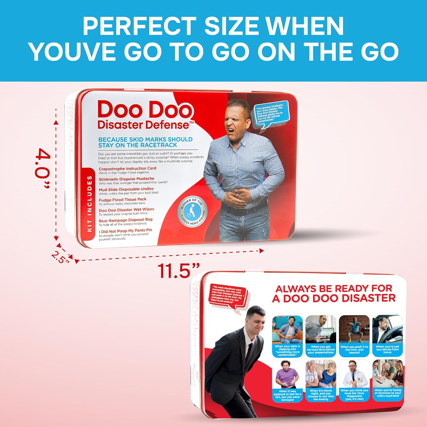 Most Complete Kit – The Doo Doo Disaster Defense is the most complete Emergency Poop kit, including 7 items: Clean Undies, Wet Wipe Pack, Tissue Pack, Disguise Mustaches, Disposable Bag, Clip On Badge, Instructions to walk you through the dirty work, and a Metal Case for reliable storage.