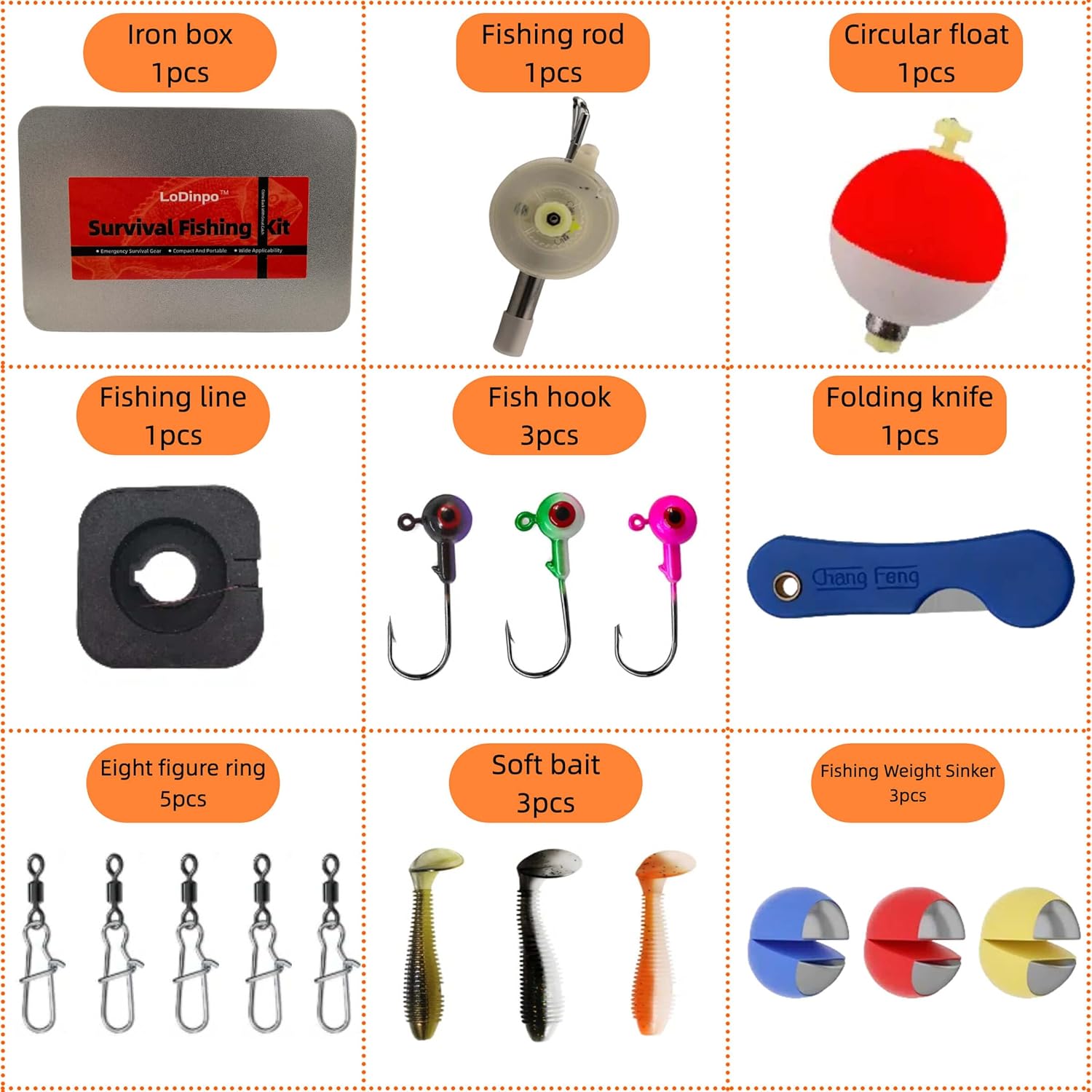 The Lodinpo portable fishing tin box is an emergency fishing kit jointly designed by survival masters and fishermen to meet the needs of fishing in Lure fishing, USA. It can be placed in your survival kit , emergency survival kit and first aid kit for car. 21 Fishing Starter Kit , camping essentials : One telescopic fishing rod One fishing wheel One 50-meter fishing line One front wire ring Three fishing weights Three soft baits Three jig heads for fishing Five eight-shaped rings One circular float One folding knife One Scratch proof sleeve