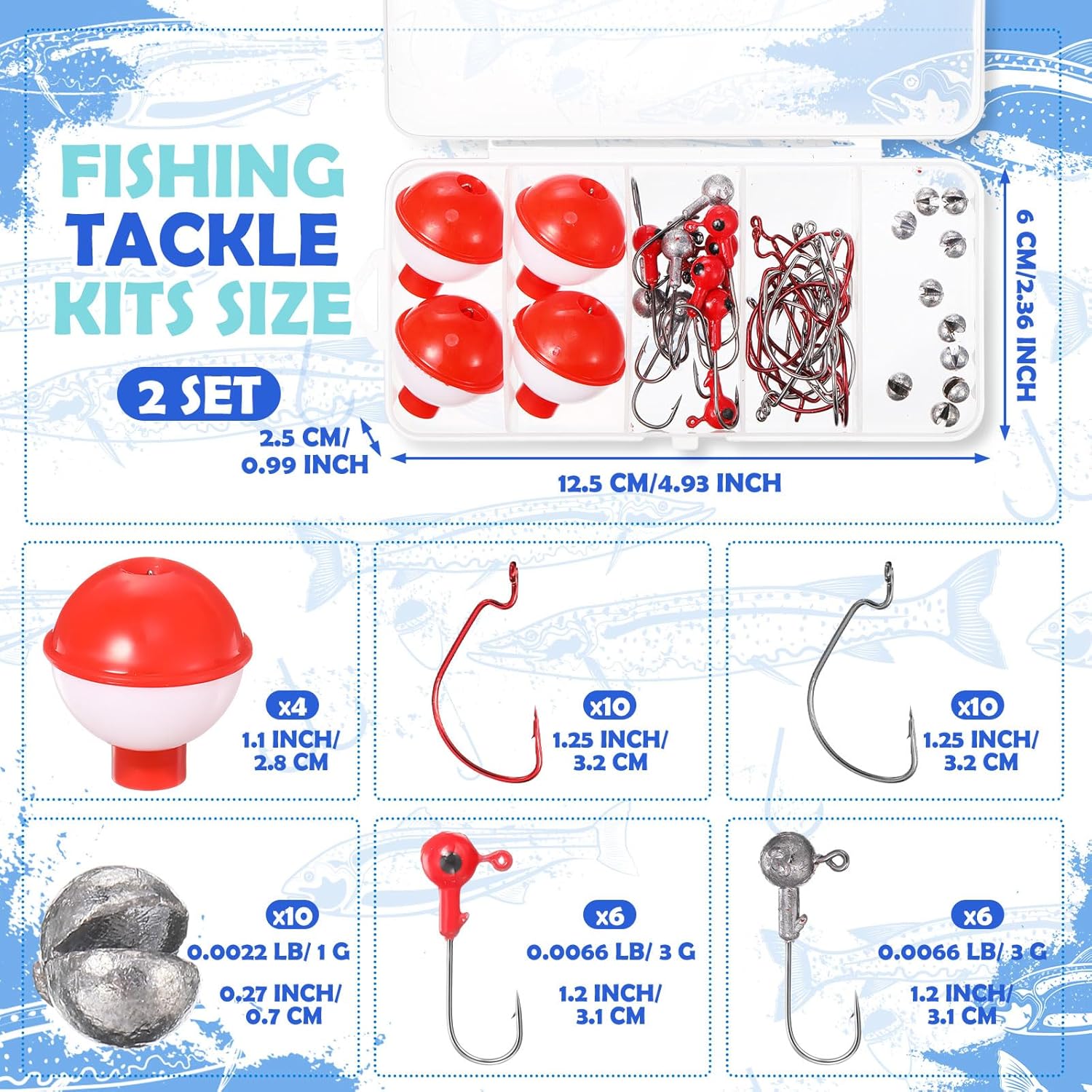 Package Includes: you will get 2 sets beginners fishing tackle kits, each set contains essential accessories such as 10 fish sinkers, 10 black fish hooks, 10 red fish hooks, 4 floats, 12 Jig head hooks in red and natural metal colors, ensure you can enjoy the fun of fishing in nature anytime and anywhere
