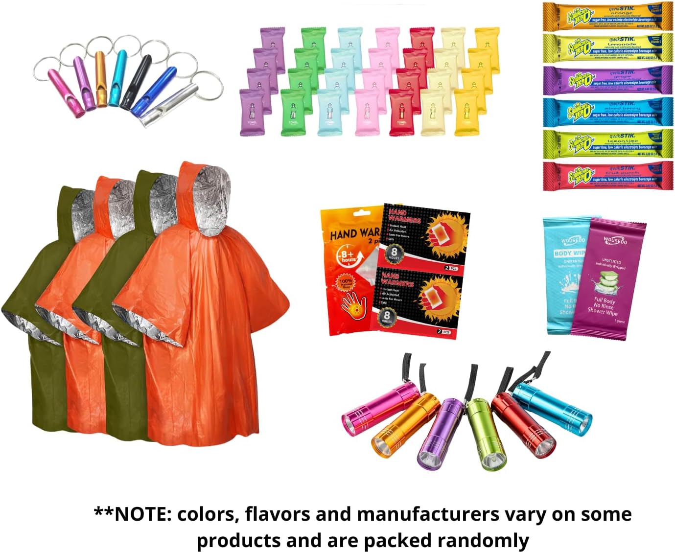 COMPREHENSIVE KIT – Compact flashlight version with AAA batteries installed. Contains emergency water, insulated rain poncho, thermal blanket, electrolytes, first aid supplies, hand warmers, compressed towels, body wipes, emergency whistle and face mask.