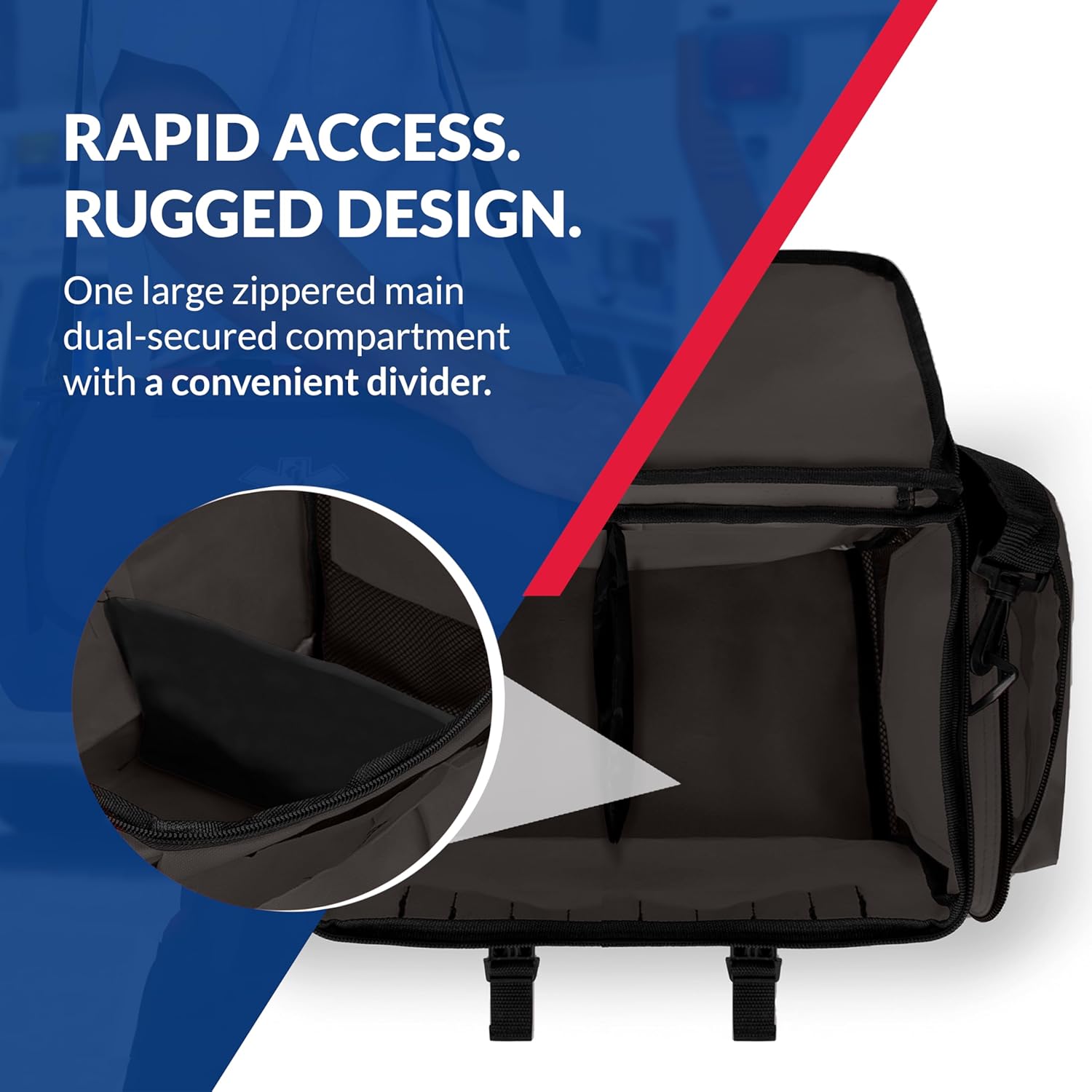 FIRST RESPONDER BAG – An ideally sized 17″ x 7″ x 7″ bag that’s large enough to hold a wide variety of equipment while still being small enough to carry with a comfortable shoulder strap. One large main dual-divided compartment and side pouches secured by both velcro and buckles. Two front pockets make for easy and quick access for frequently used equipment, and the two zippered side pockets make organization even easier.