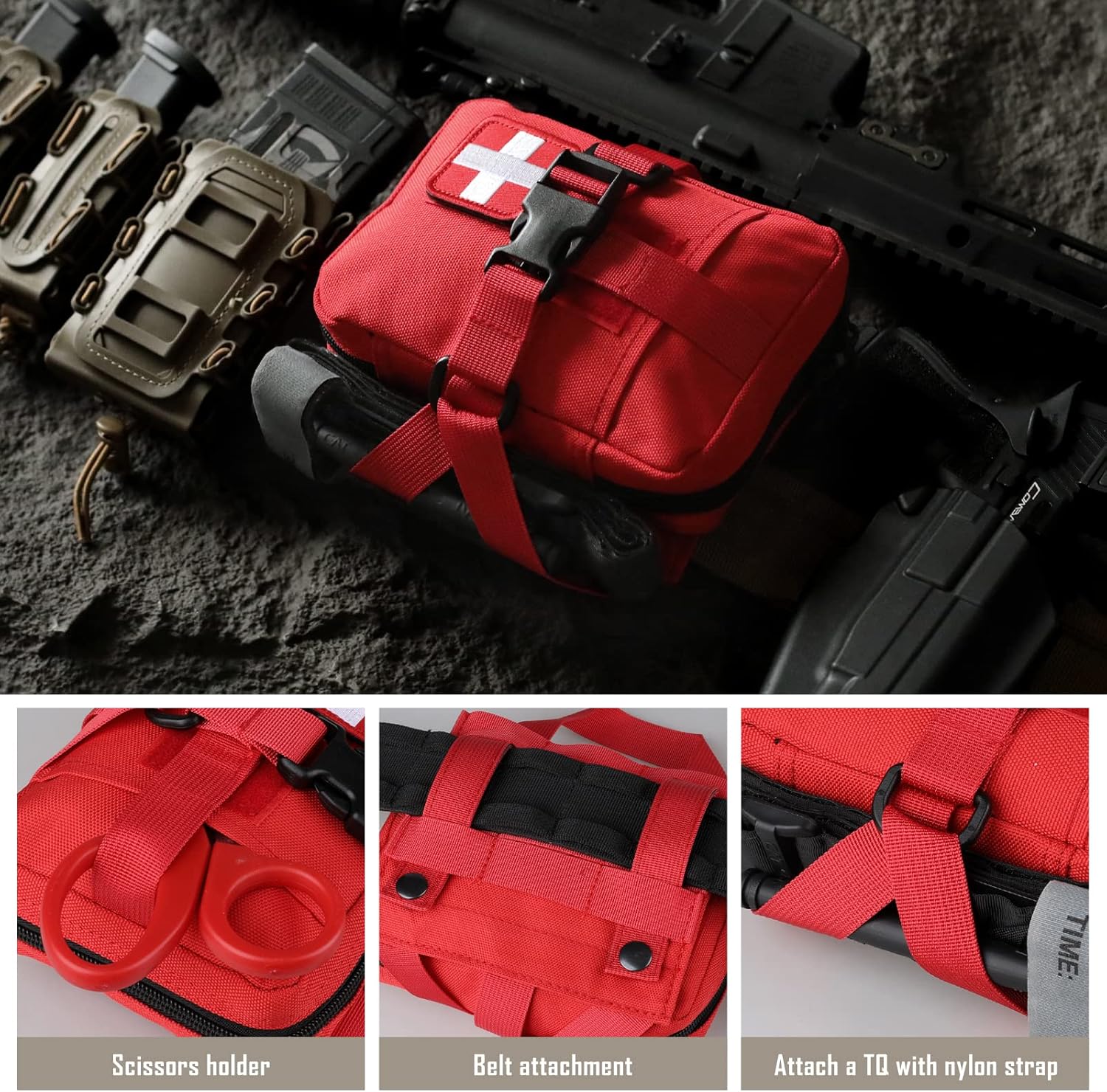 Stay Mission-Ready: IFAK pouch’s front buckle and bottom straps securely hold EDC gears like flashlights and pens. Includes a reflective red cross patch for visibility—your go-to medical kit for outdoor emergencies.