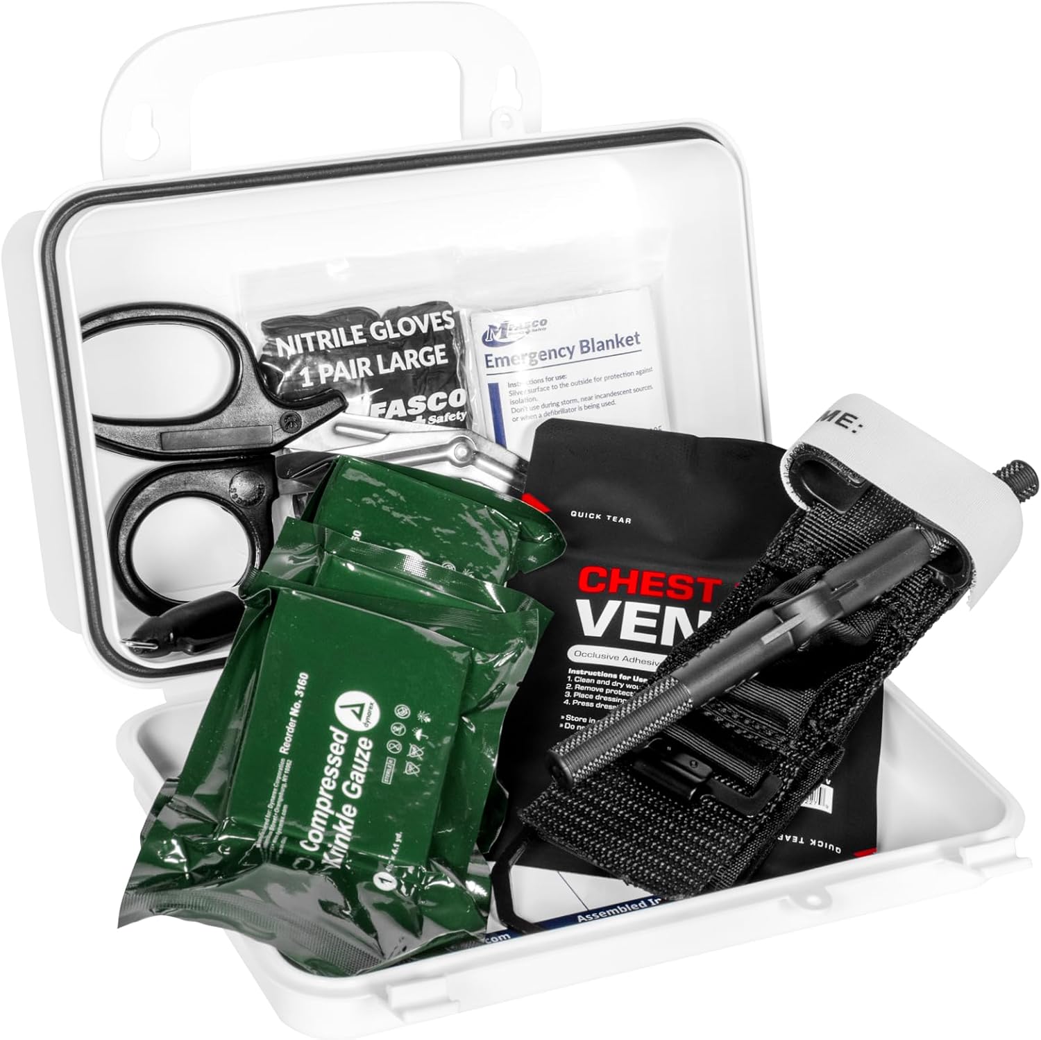 Sturdy & Portable: The MFASCO Stop The Bleed Kit Plus Chest Seal is housed in a sturdy, compact plastic box measuring 8.5″ x 5.5″ x 3.5 inches. Carry it with ease or mount it on walls and doors for convenient access. Keep it in cupboards, closets, toolboxes, or alongside your AED to ensure readiness in any situation.