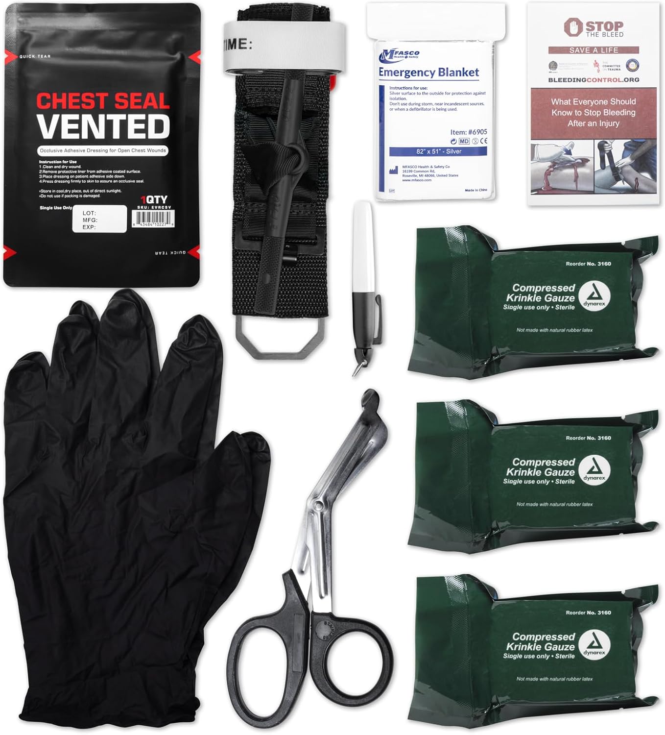 Tourniquet: Included in our kit is a high-quality tourniquet, compressed gauze bandages for stopping bleeding, and a chest seal for sealing penetrating wounds such as gunshots or stabbings.