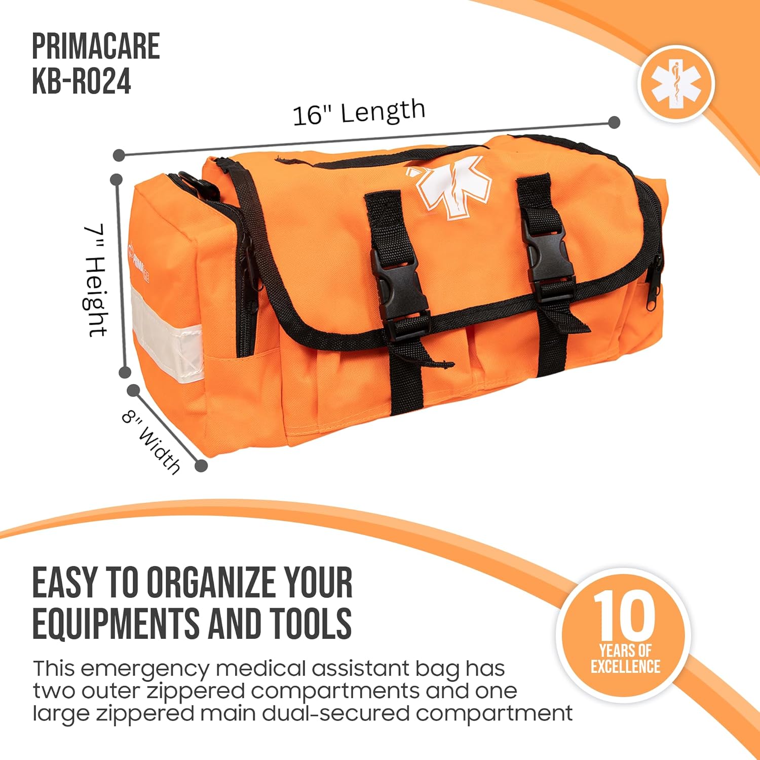 Primacare presents a large O2 Bag that is made of nylon material with heavy-duty zippers for long-lasting durability. The base of the bag is water-poof to keep your equipment safe and dry during an emergency in a wet environment. Oxygen O2 Gear Bag is with a huge main compartment, 2 large full-length gusseted side pockets, 1 easy-access end pocket, two zippered pockets, etc for keeping O2 Supplies organized. Features a strap system for an O2 bottle and enough space for other equipment like BVMs, nasal cannulas, nasal catheters, etc. This bag is big in size to meet your needs. It measures: 32.36 x 12.76 x 12.44 inches and the main compartment is 25 x 10 x 9 inches. Comes in bright orange color for easy visibility and a professional look. Carry the bag with the wide webbing handles or the large shoulder strap for carrying comfortably. Big enough to hold a wide variety of tools and equipment.