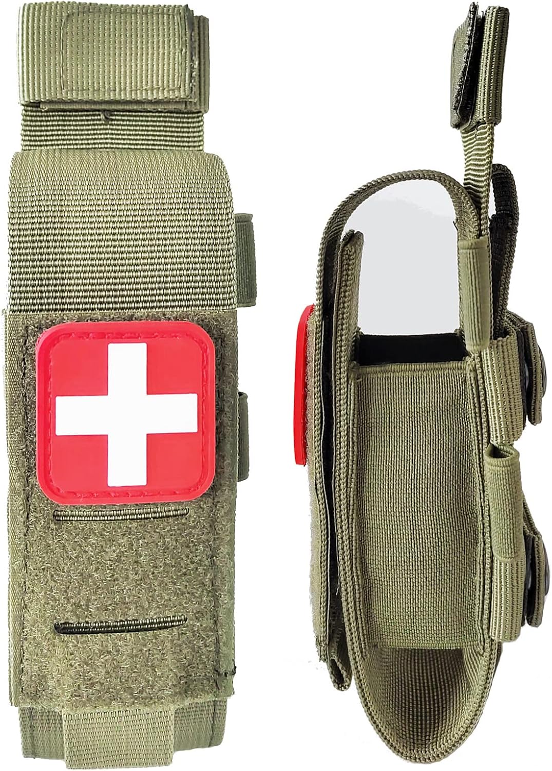 Molle Tourniquet Holder:Very easy to hold tourniquet,Shears,Pens snugly and mounts securely to MOLLE. Easy comfortable to wear on a tactical belt and easy to install on any bag.This is a great addition to any duty belt or vest.( The pouch can be attached on horizontally and vertically.)