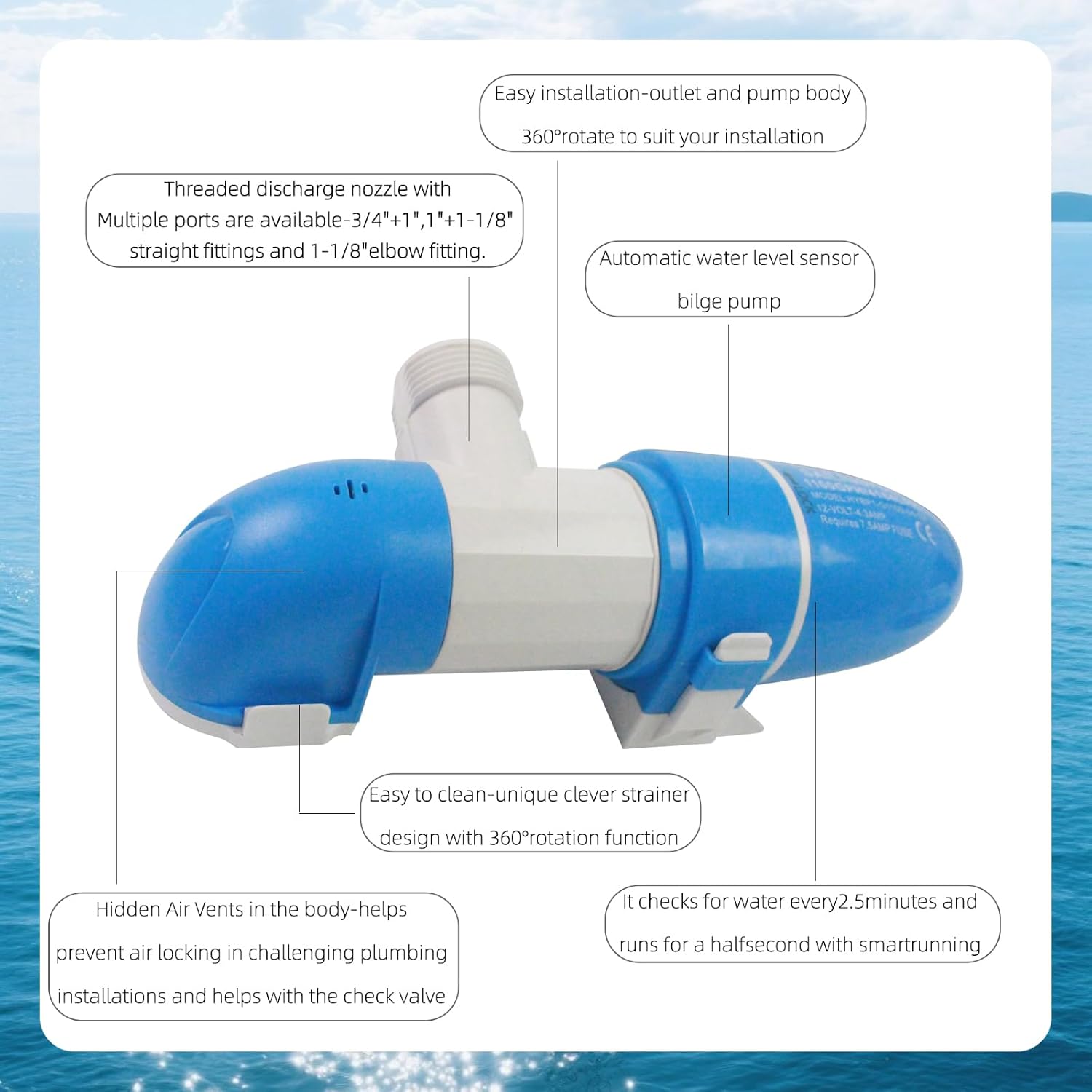 [PARAMETER]: Flow Rate: 1100 GPH Voltage: 12V DC Max Draw: 4.2A Max Head: 13 feet (4.0 m) Operation: Automatic with water sensing Outlet Diameter: 3/4 inch (19 mm), 1 inch (25 mm)straight fittings, 1-1/8 inch (29 mm) elbow fitting and ignition protected.